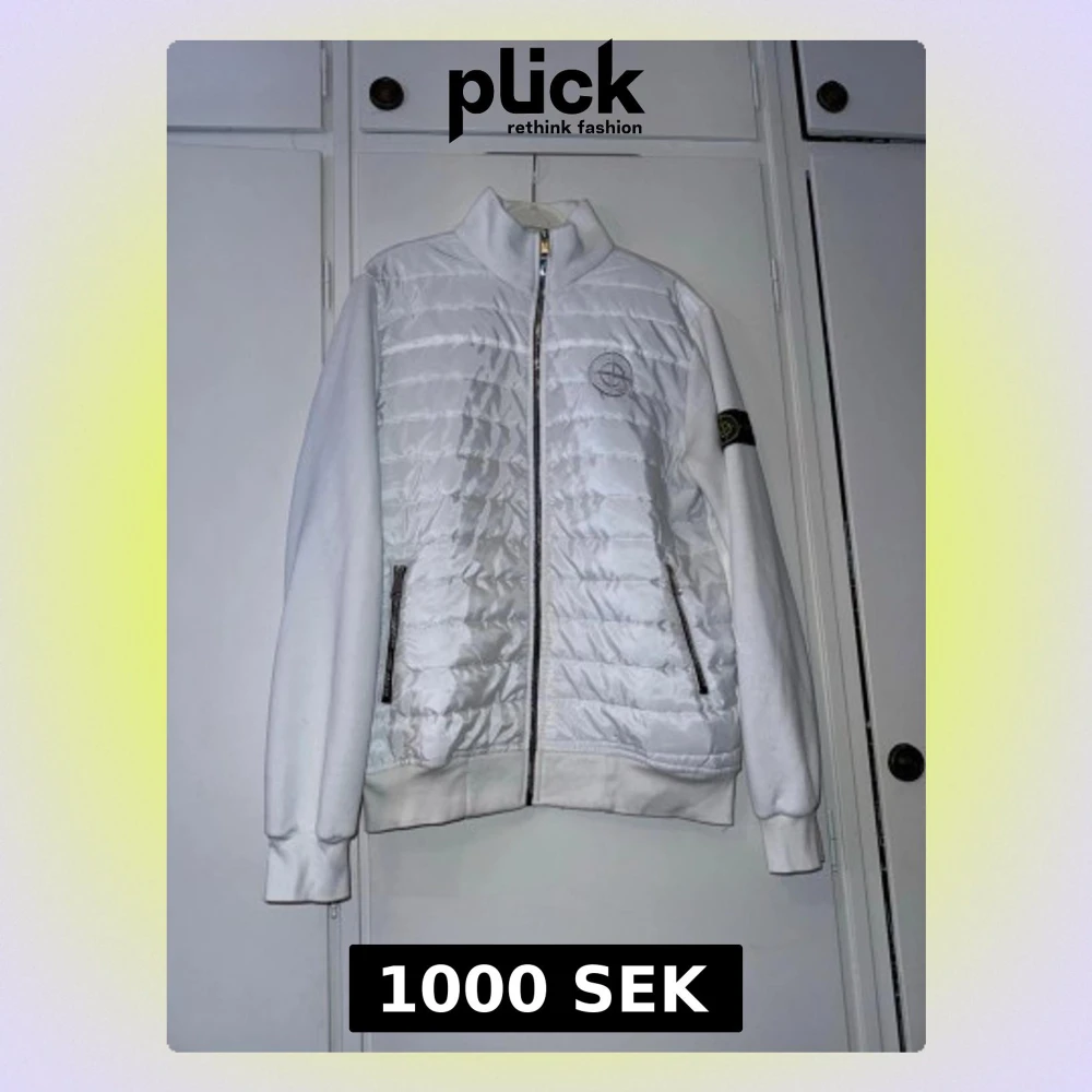 Vit cardiagan från Stone Island med quiltad framsida och klassisk logotyp på ärmen. Jackan har dragkedja framtill, två sidofickor med dragkedja och ribbade muddar. Materialmix med polyester och bomull, perfekt för dig som gillar clean och sportig stil. Den har inga fläcker eller något cardiagnen är i topp skick. Om du har några frågor eller funderingar är de bara att skriva