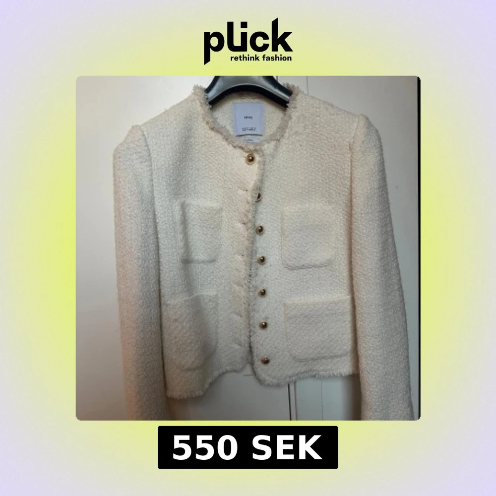 Snygg vit cardigan jacka från MANGO med guldknappar och fyra fickor framtill. Jackan har en strukturerad, lite ruffig yta och är croppad i modellen. Perfekt för dig som vill ha en chic och trendig look.