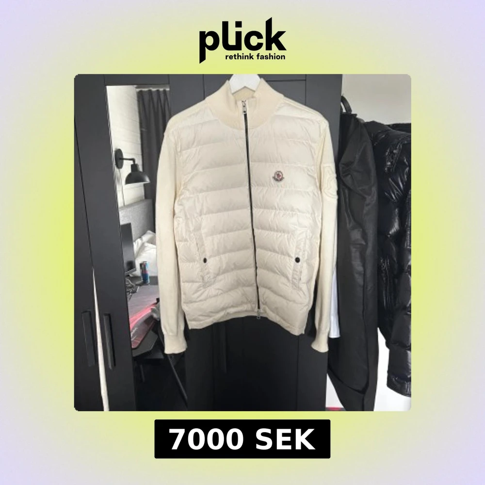 KVITTO FINNS!!! knappast använd haft den i ett halvår.köpt för 9500 på NK. Säljer en stilren vit cardigan jacka från Moncler med quiltad framsida och stickade ärmar. Jackan har dragkedja, två fickor med knappar och Moncler-logga på bröstet. Perfekt för dig som gillar exklusiva och snygga plagg.