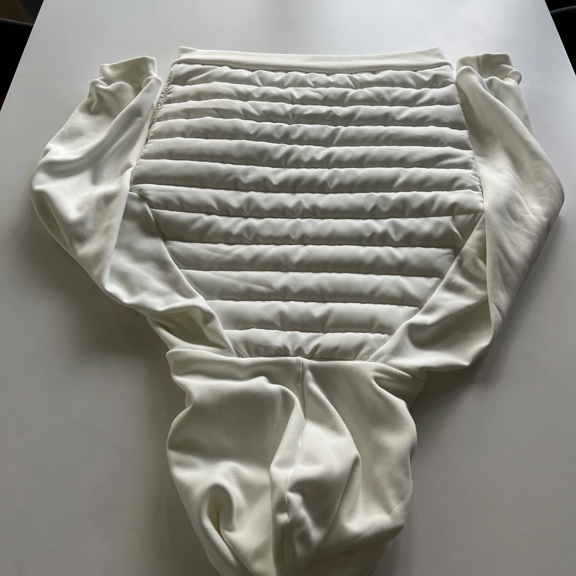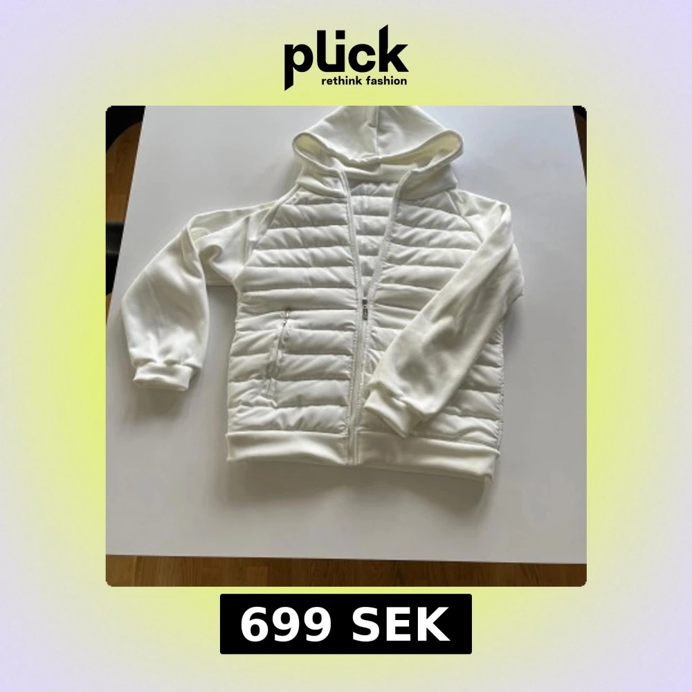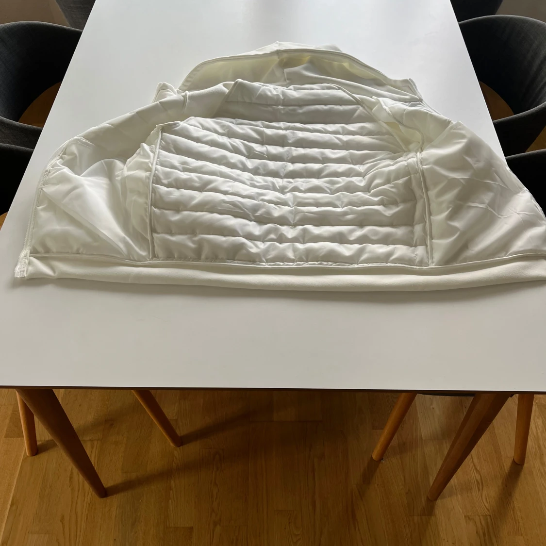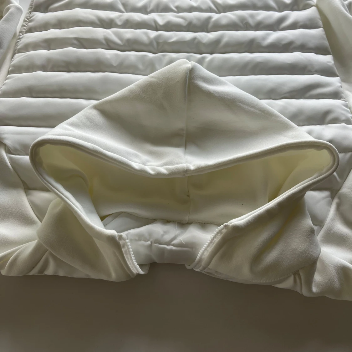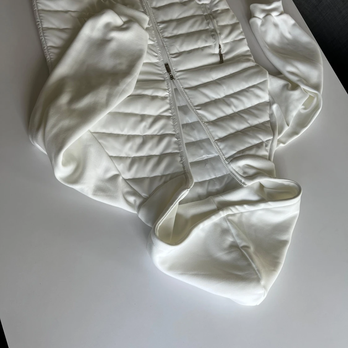 Snygg vit cardigan med quiltade partier och dragkedja framtill. Jackan har huva, ribbade muddar och två fickor med dragkedja. Perfekt för dig som gillar en clean stil. Materialet är mjukt och känns skönt mot huden.