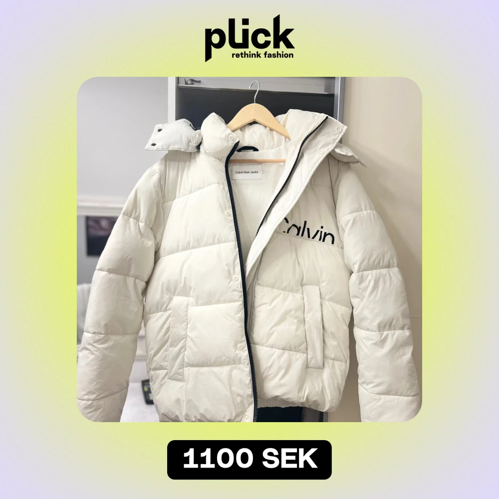 Säljer en snygg vit dunjacka från Calvin Klein i mycket bra skick. Jackan har en stor logga på bröstet och ryggen, dragkedja och knappar framtill, samt en mysig huva. Perfekt för kalla vinterdagar! ❄️Jag har endast använd den 1 vinter och de va ca 1-2 månader bara, anledningen till att jag säljer den är för att jag köpte en ny jacka.
