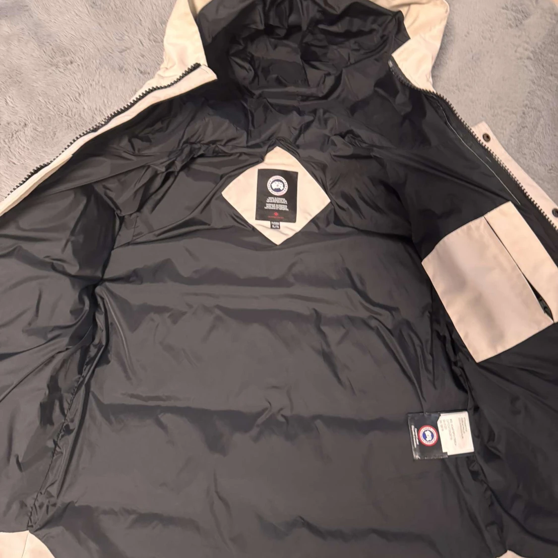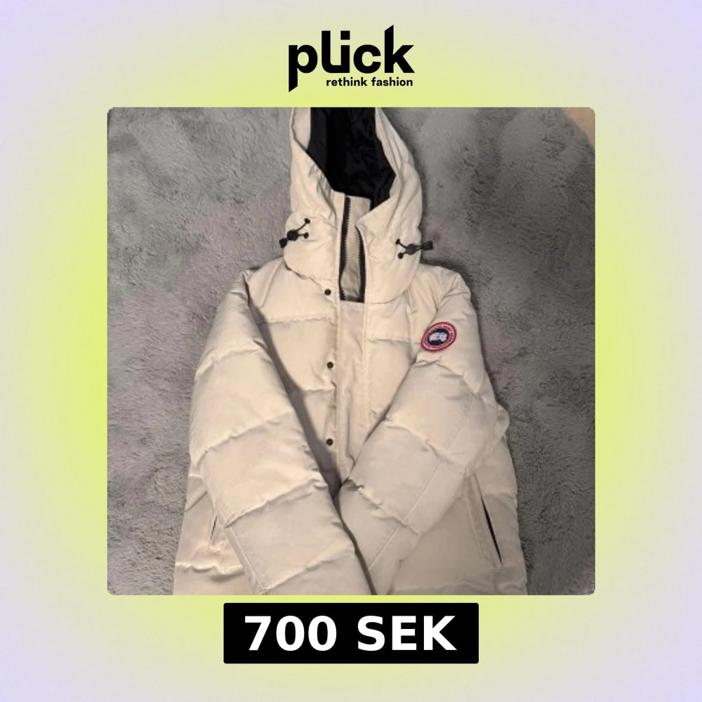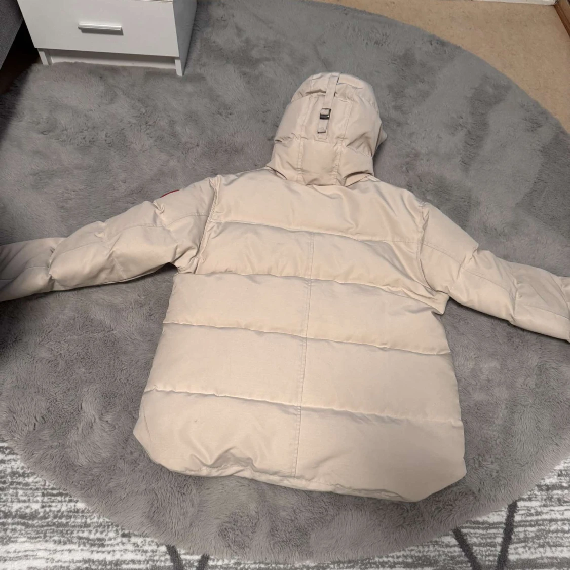Säljer en snygg vit dunjacka från Canada Goose med huva och svart innerfoder. Jackan har dragkedja, knappar och justerbar snörning vid huvan. Perfekt för kalla dagar och har den klassiska Canada Goose-loggan på bröstet.