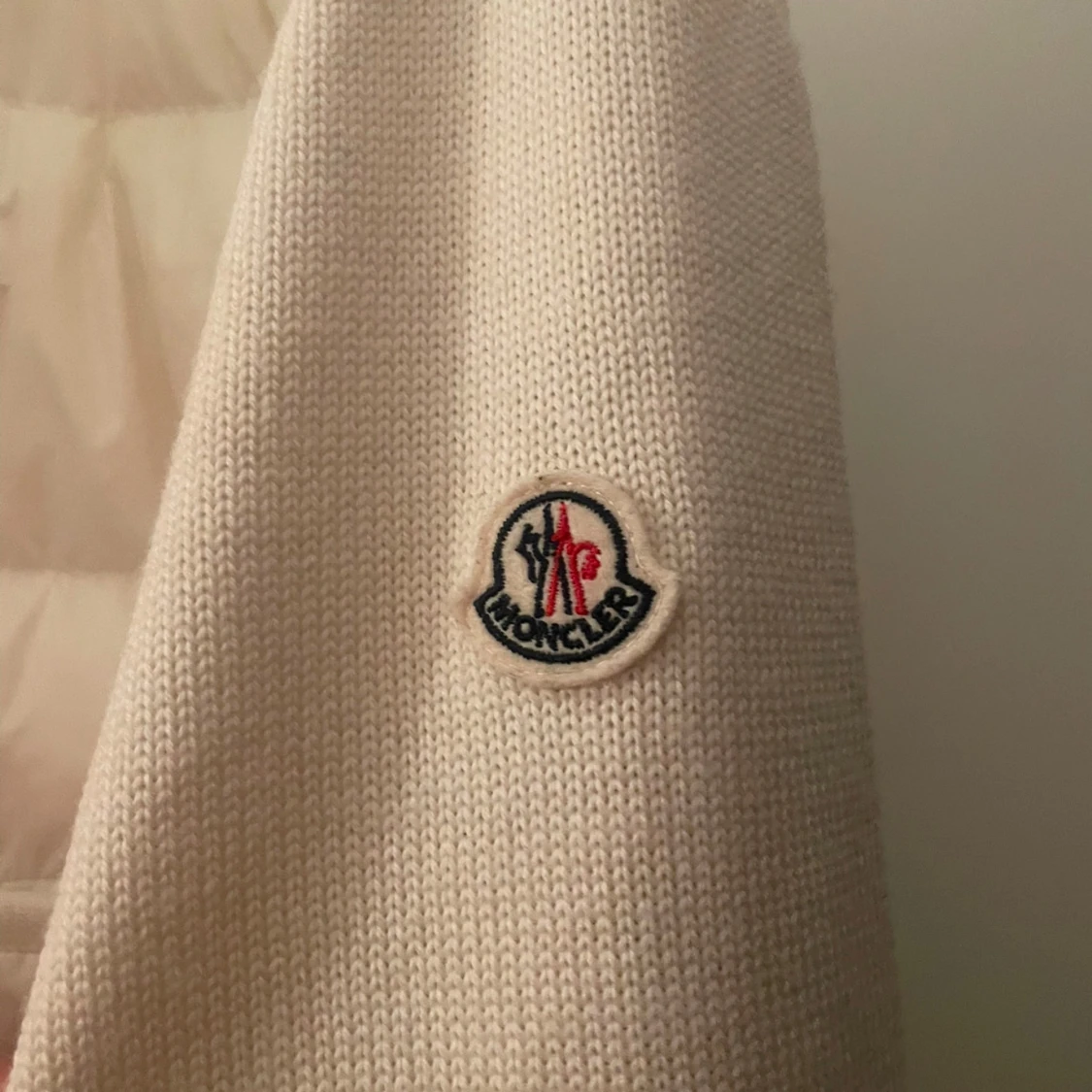 Säljer en stilren vit dunjacka från Moncler med knappar framtill. Jackan har långa ärmar och en quiltad design som ger en snygg look. Perfekt för kyligare dagar. Nypris: ca-8000kr, sparsamt använd, passar personer med M och L