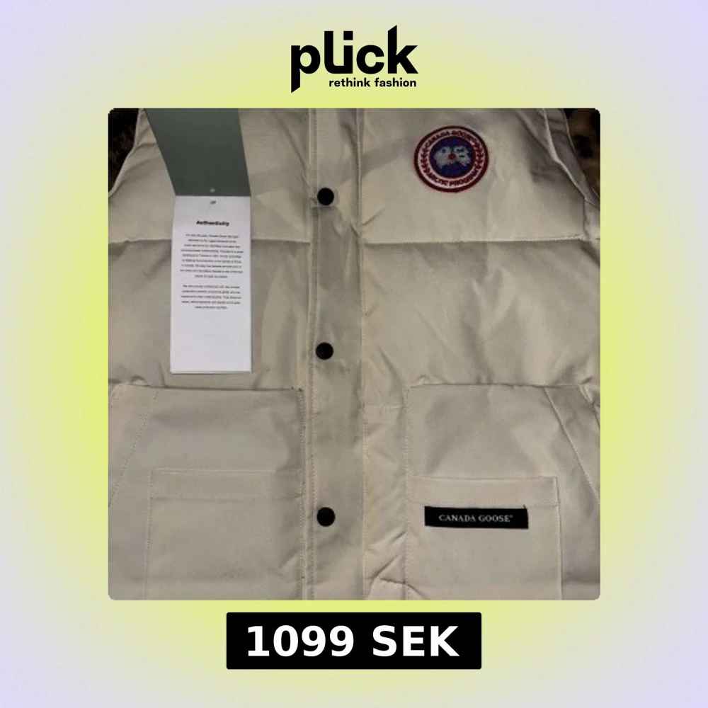 Säljer en snygg vit dunväst från Canada Goose med klassisk logga på bröstet och svarta knappar. Västen har två stora fickor framtill och en diskret etikett med varumärket. Perfekt för lager-på-lager-stil.