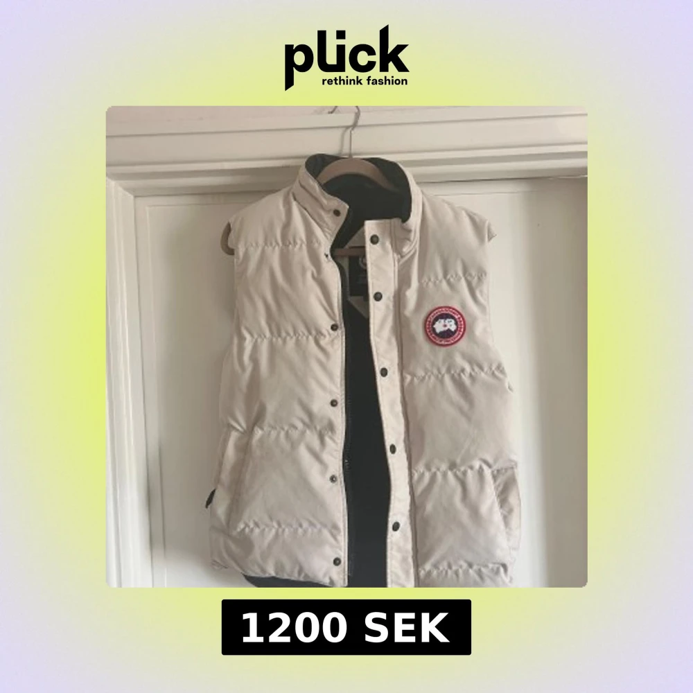 Säljer en vit dunväst från Canada Goose med klassisk logotyp på bröstet. Västen har hög krage, dragkedja och knappar framtill samt två fickor på sidorna.