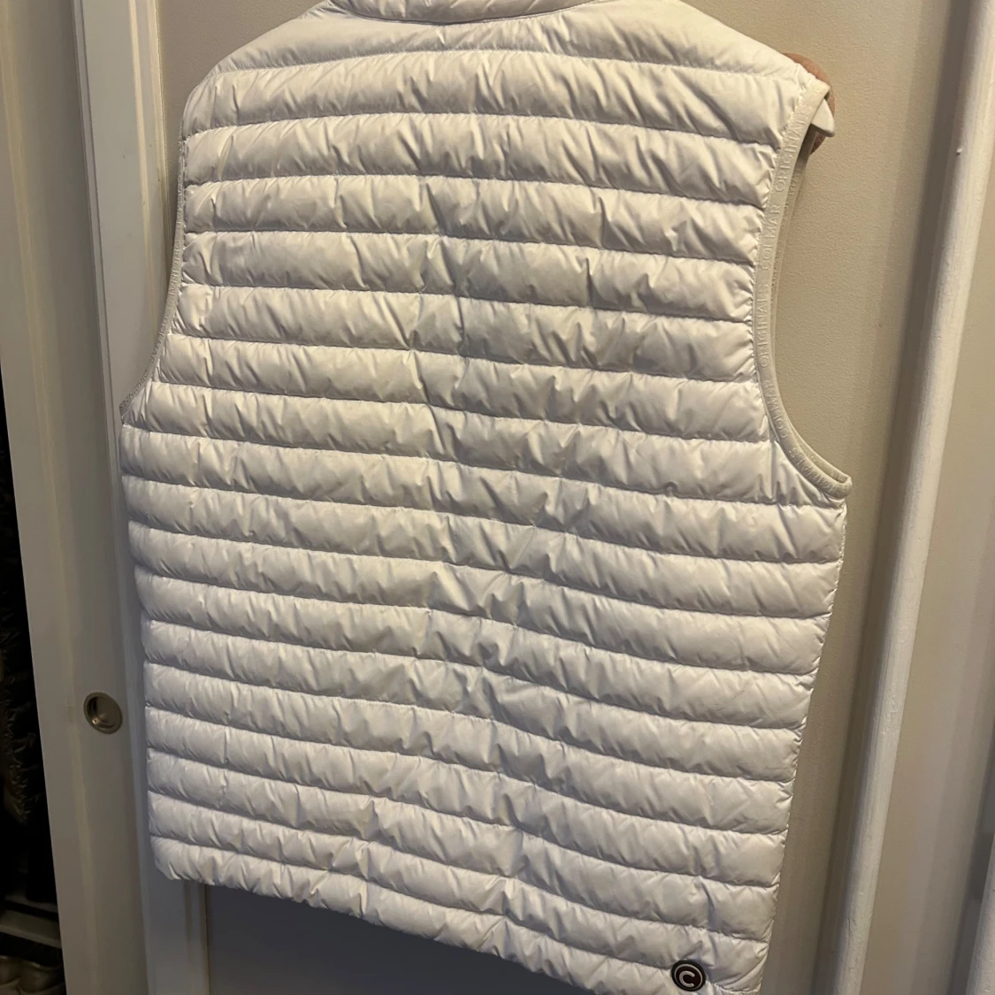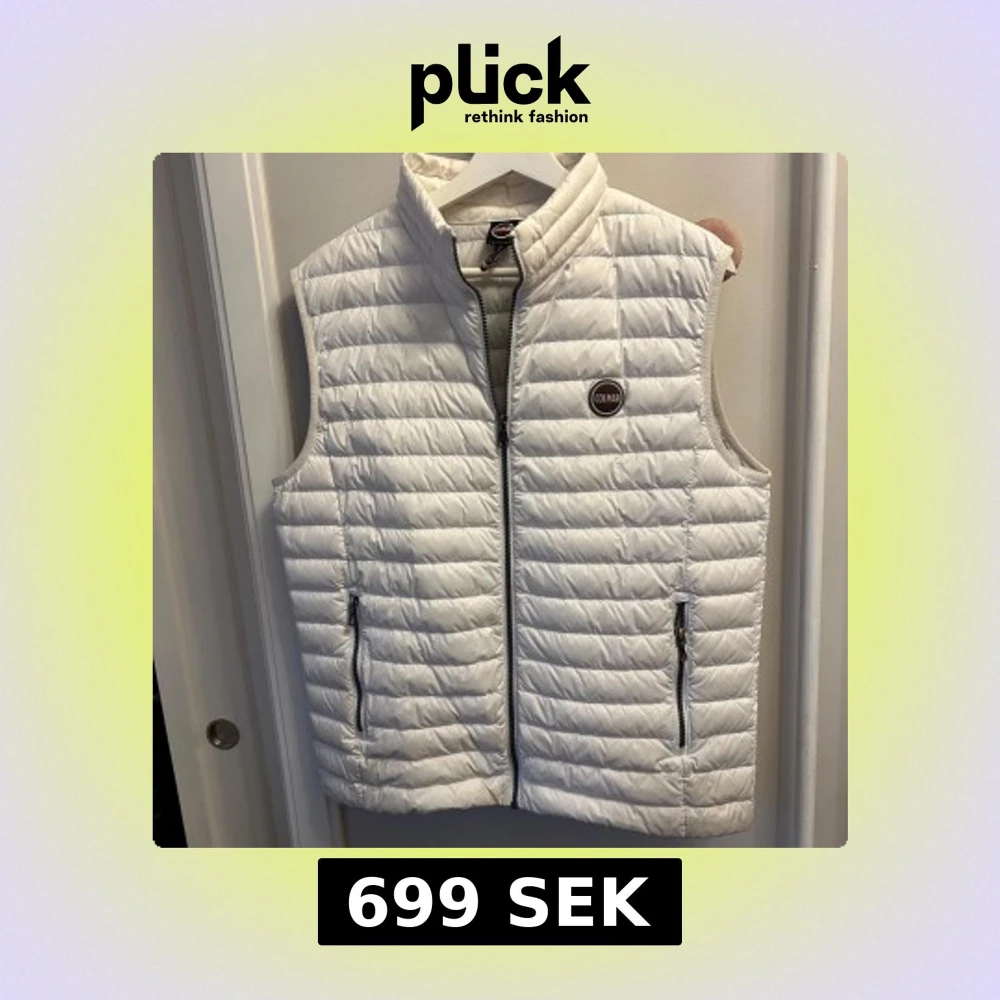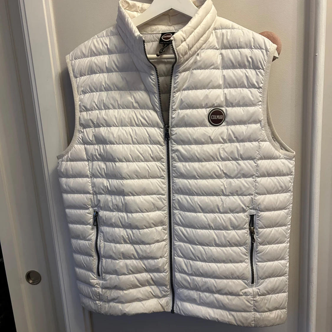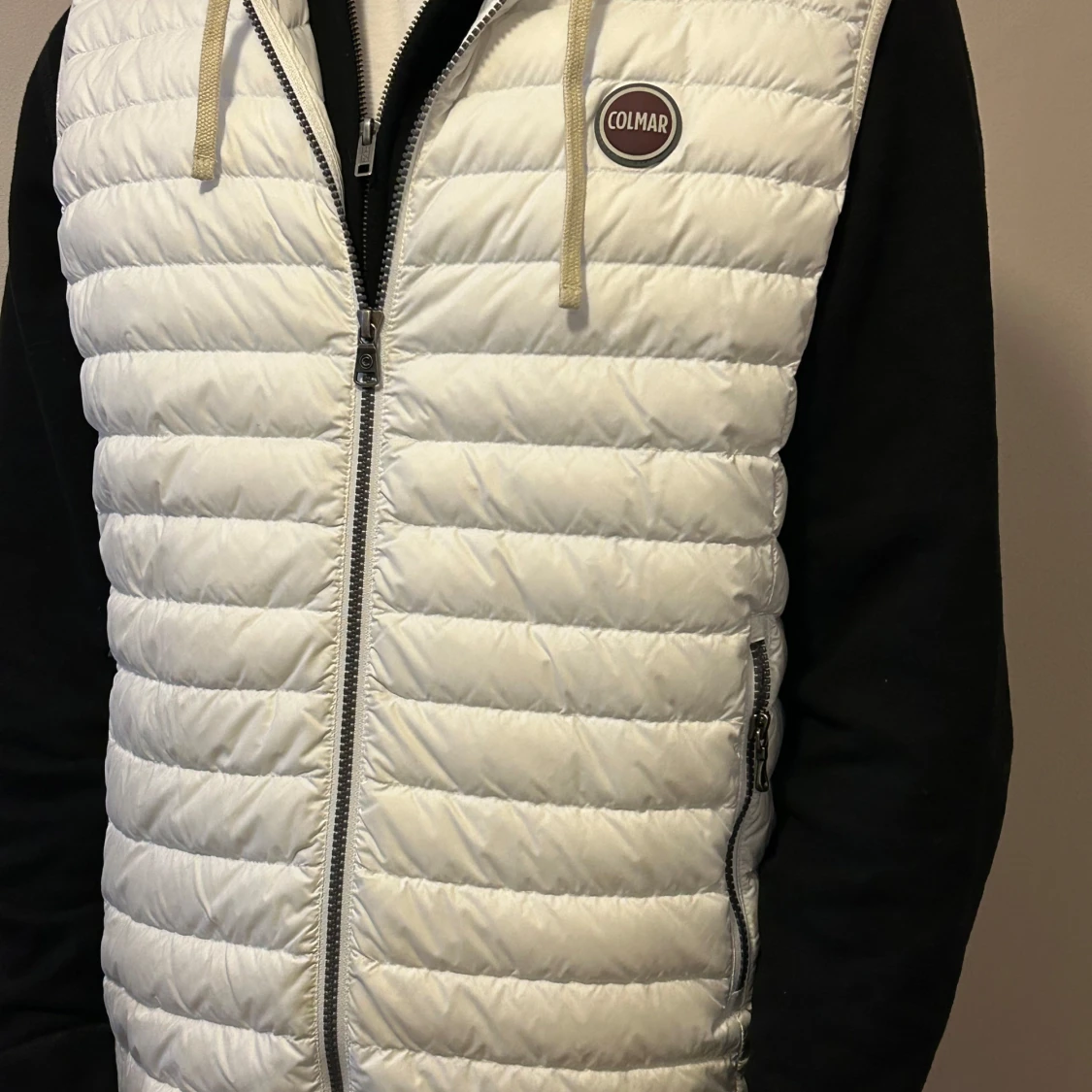 Säljer en stilren vit dunväst från Colmar med dragkedja och två praktiska fickor framtill. Västen har en quiltad design och är perfekt för kyligare dagar. Den har en diskret logotyp på bröstet och passar bra över en hoodie eller tröja. Jackan har inga skador eller liknande men lite missfärgad på sidorna men inget man ser när den andvänds