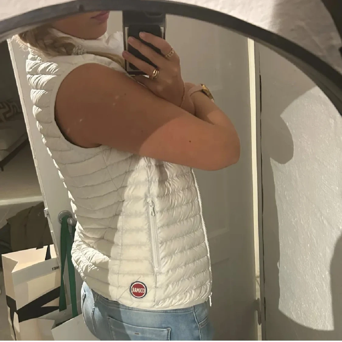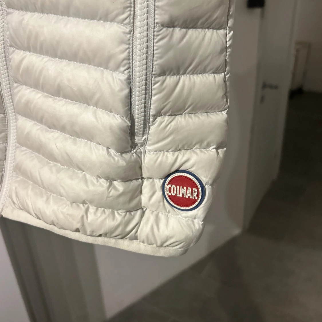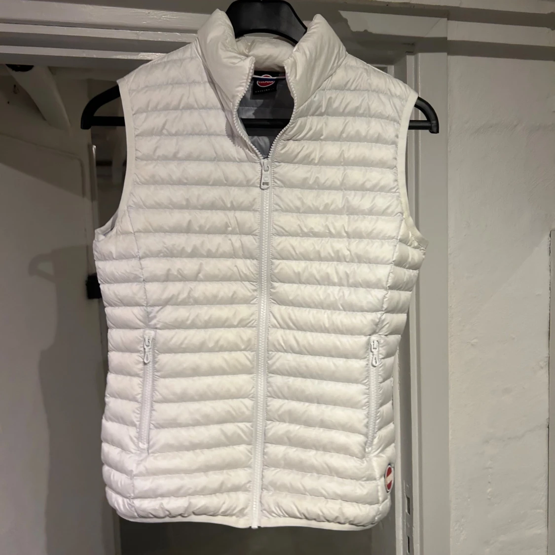 Såå snygg vit väst från Colmar med quiltad design och hög krage. Västen har dragkedja framtill, två fickor med dragkedja och en rund Colmar-logga nertill. Storlek ”14”, säljer då den är för liten