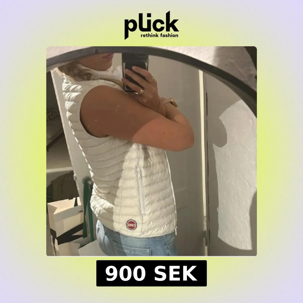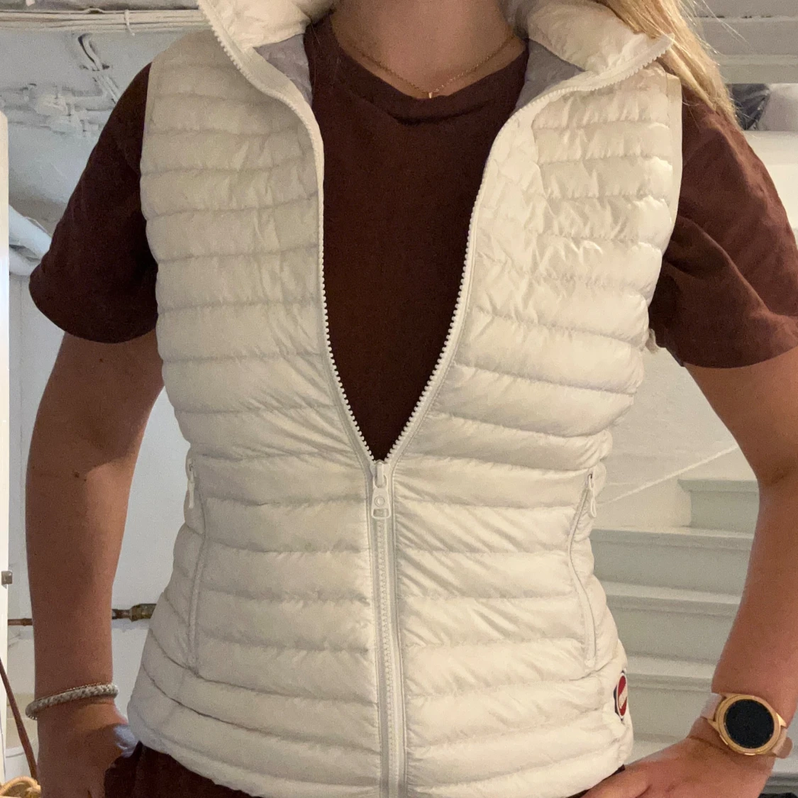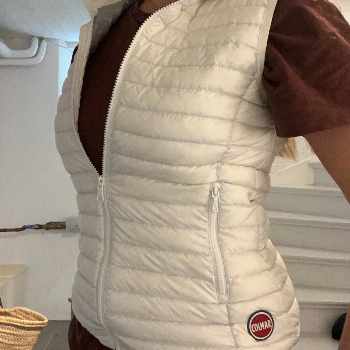 Såå snygg vit väst från Colmar med quiltad design och hög krage. Västen har dragkedja framtill, två fickor med dragkedja och en rund Colmar-logga nertill. Storlek ”14”, säljer då den är för liten