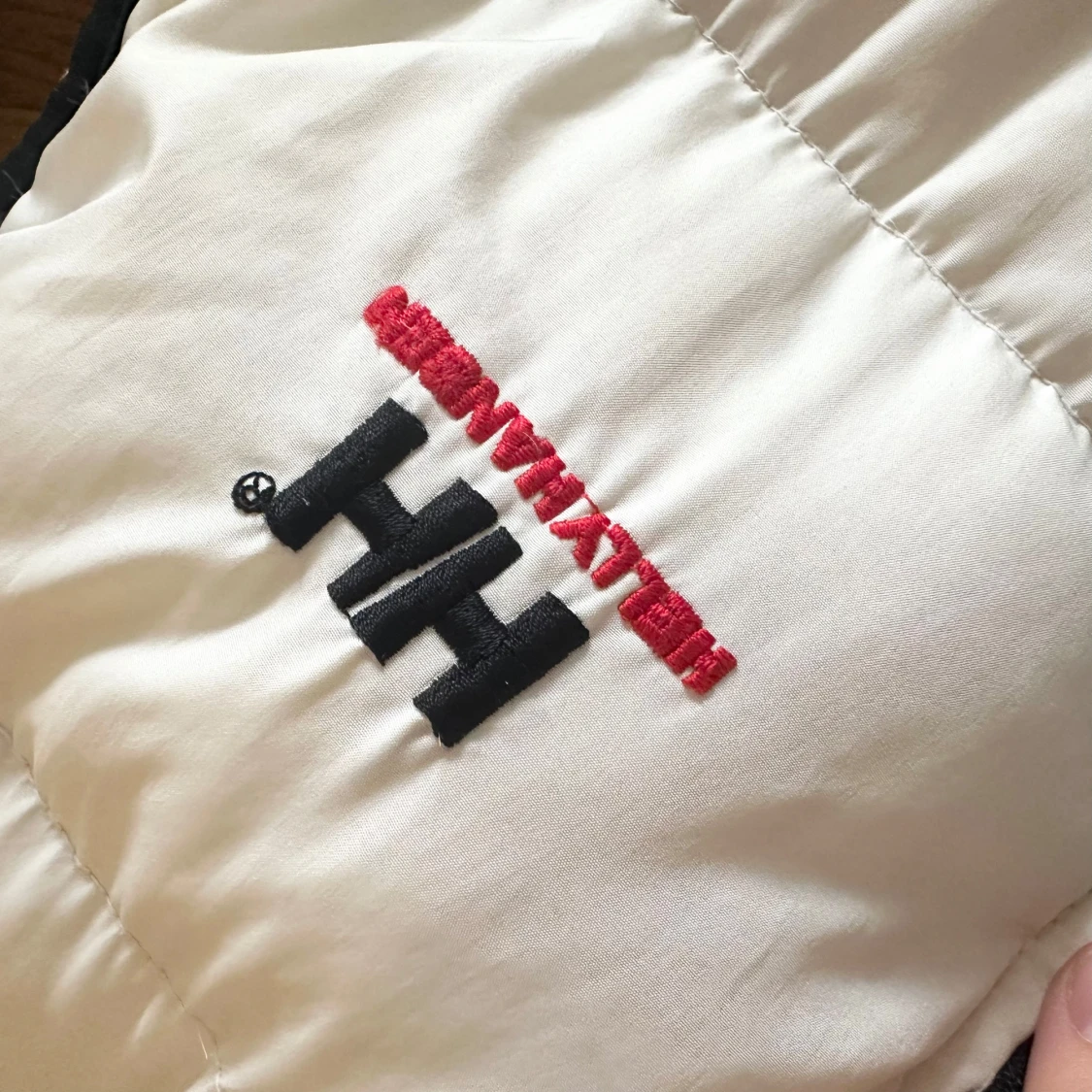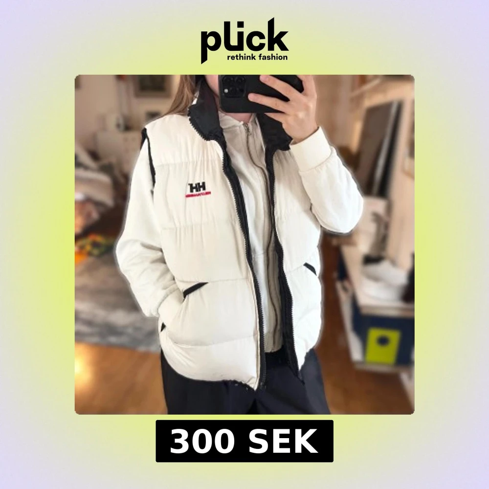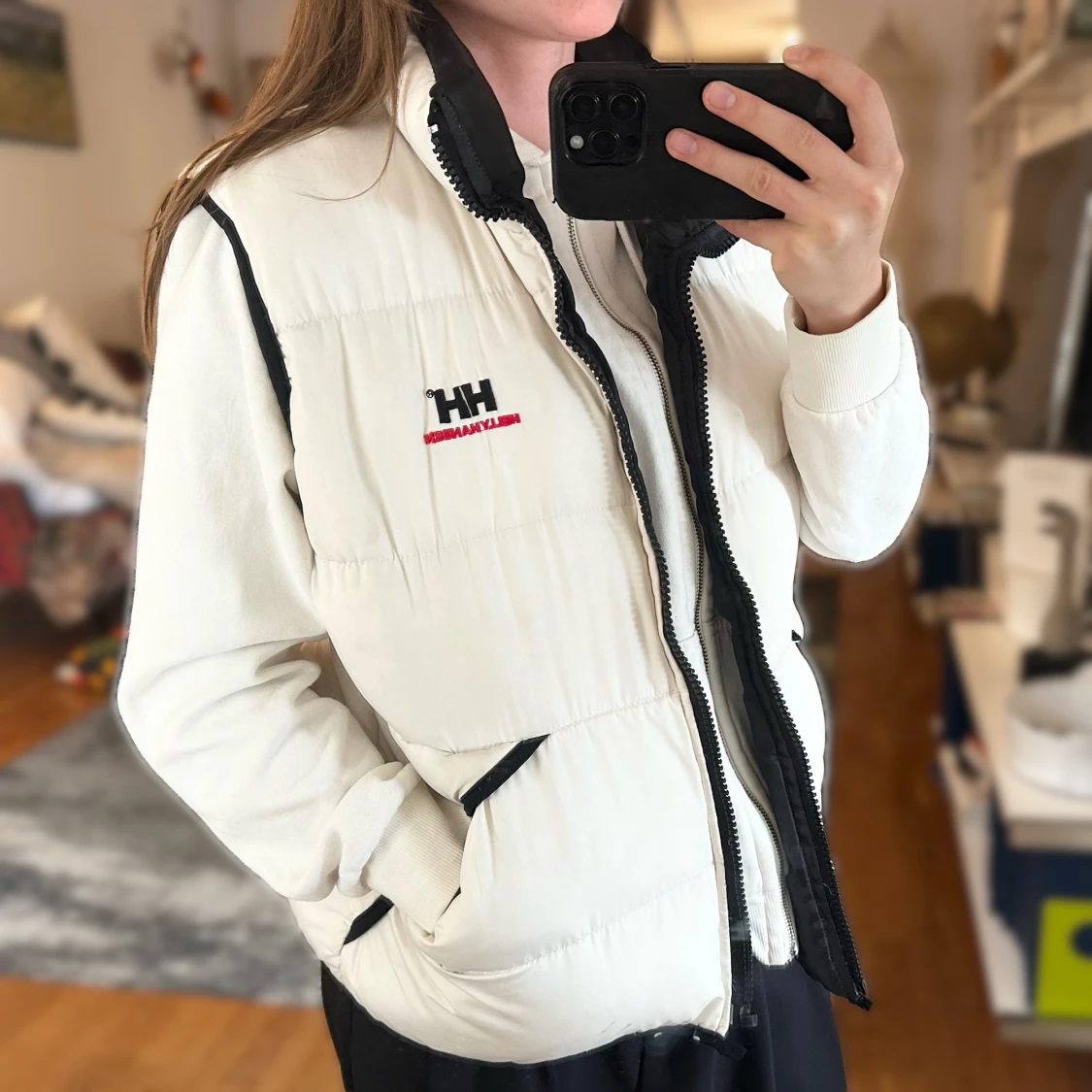 Vit dunväst från Helly Hansen med svart dragkedja och svarta detaljer vid fickor och krage. Västen har broderad HH-logga i svart och rött på bröstet. Perfekt nu inför hösten när det börjar bli lite kallare. Säljer billigt då dragkedjan tyvärr är trasig. Om du vill ha en dunväst av bra kvalité men inte betala 2000 är detta något för dig<3