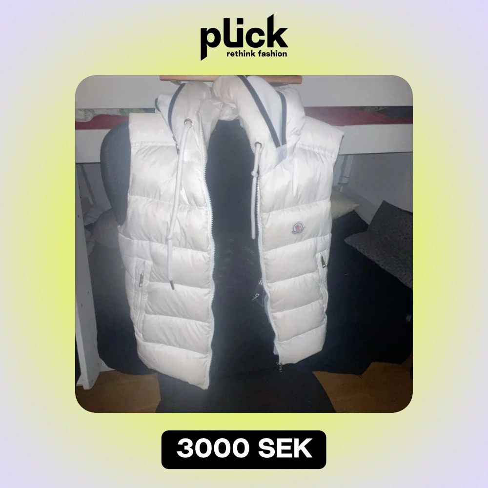 Säljer en snygg vit dunväst från Moncler i mycket bra skick. Västen har en dragkedja framtill och en mysig huva med logotypdetaljer. Perfekt för kyliga dagar och ger en stilren look. Passar bra till både vardag och fest!