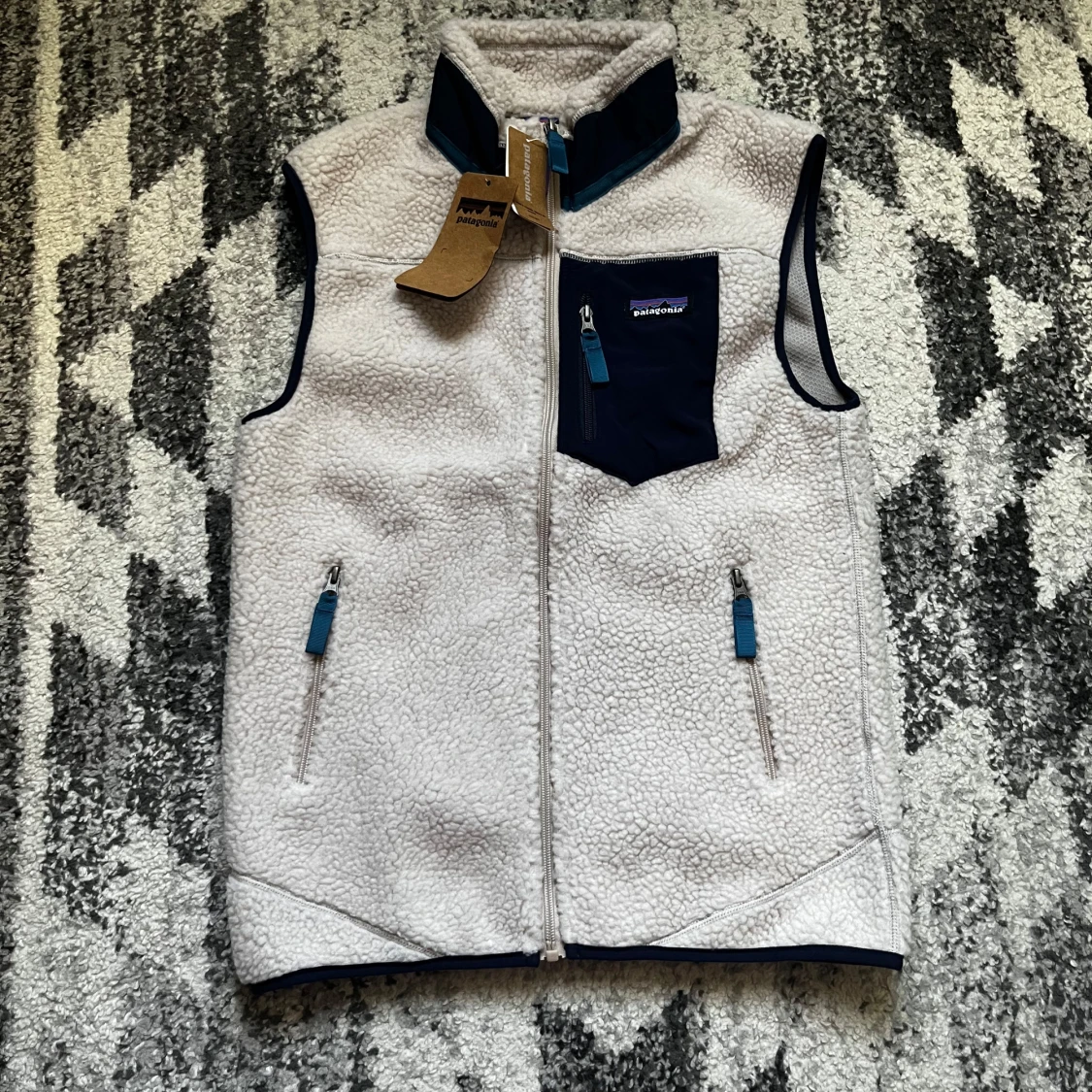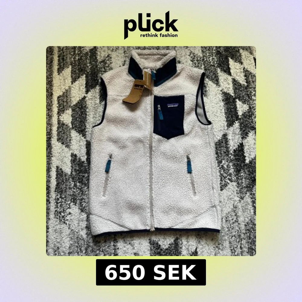 Säljer en vit fleeceväst från Patagonia med marinblå detaljer och dragkedjor. Västen har hög krage, två fickor med dragkedja och en bröstficka med logga. Perfekt för lager-på-lager och outdoor-vibes.
