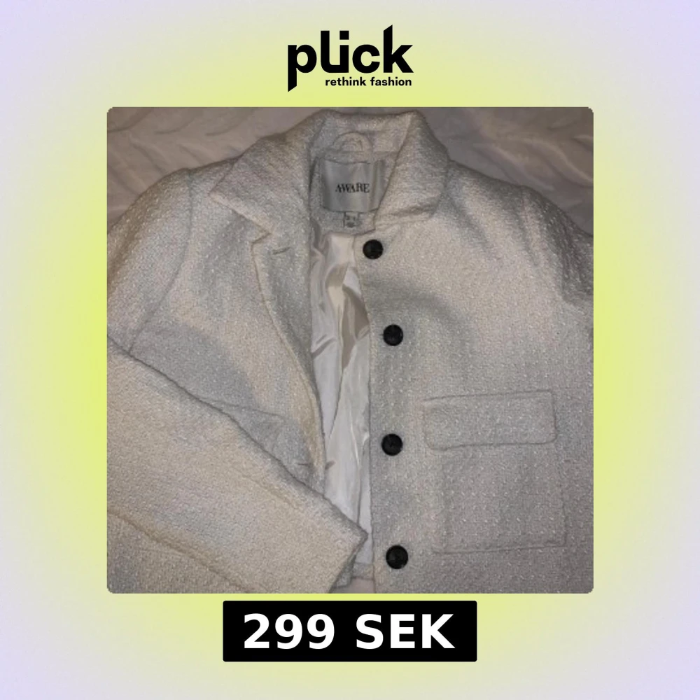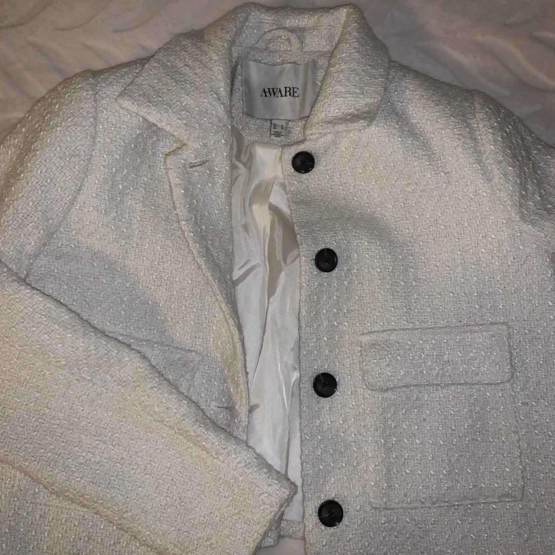Snygg vit jacka från Aware med knappar framtill och två fickor. Jackan har en stilren design och är perfekt för en elegant look. Har använt den endast EN gång, ny pris 700kr