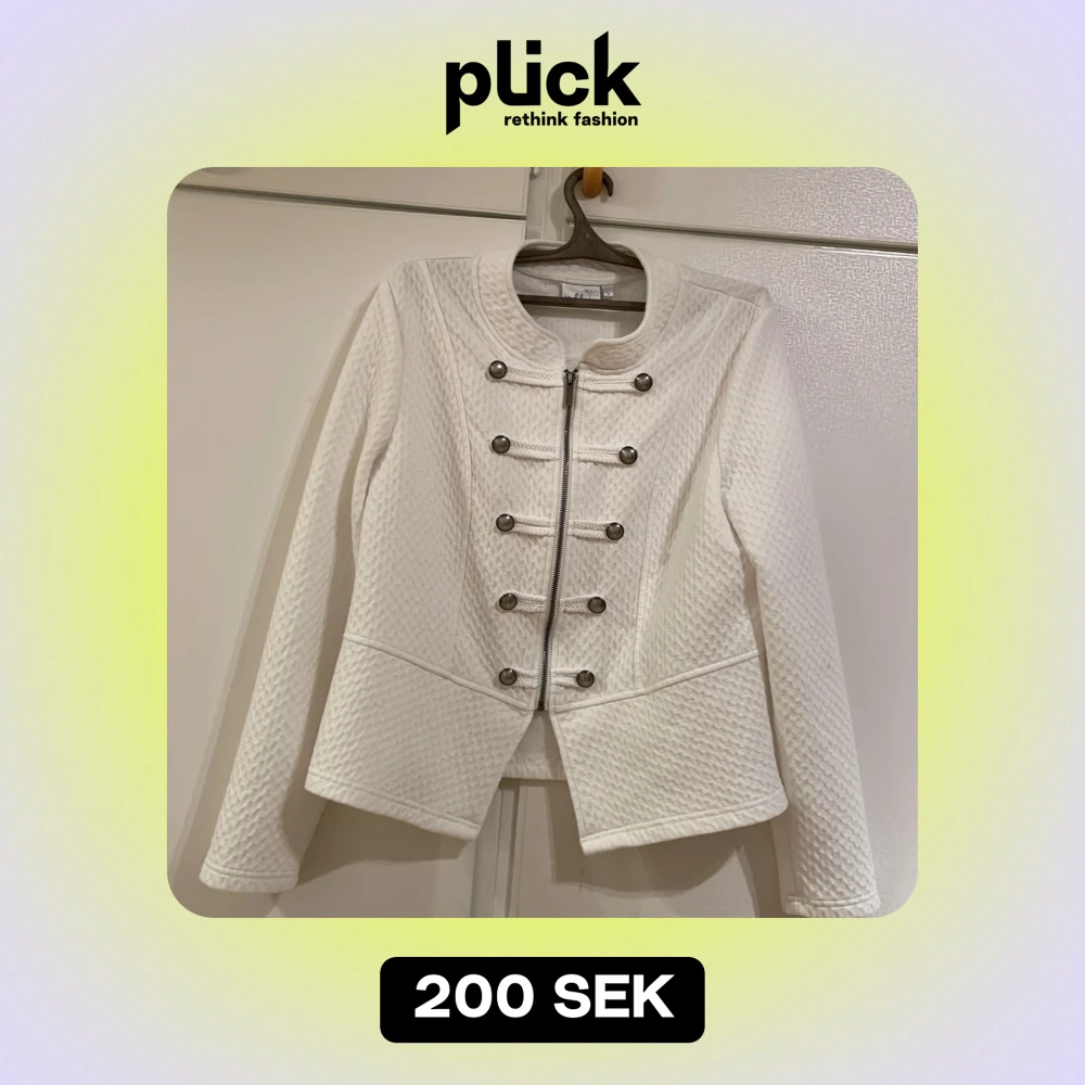 Säljer en superfin vit jacka från Isolde i storlek L. Den har en cool militärinspirerad design med dekorativa knappar och dragkedja framtill. Jackan är långärmad och har en quiltad textur som ger den en unik look. Perfekt för både höst och vår! Om ni vill kan vi prata om priset!