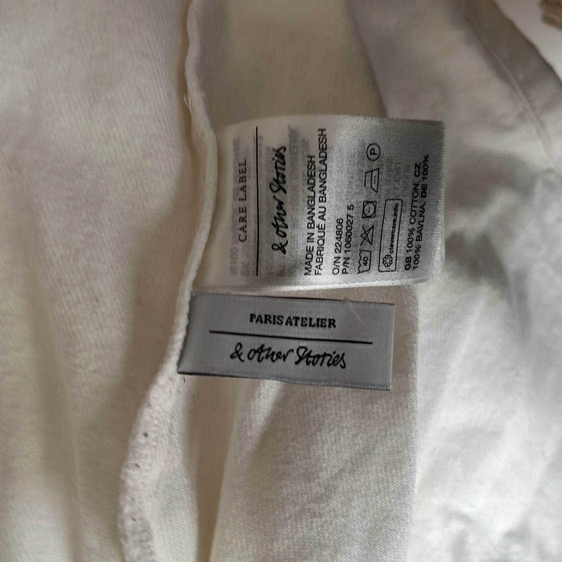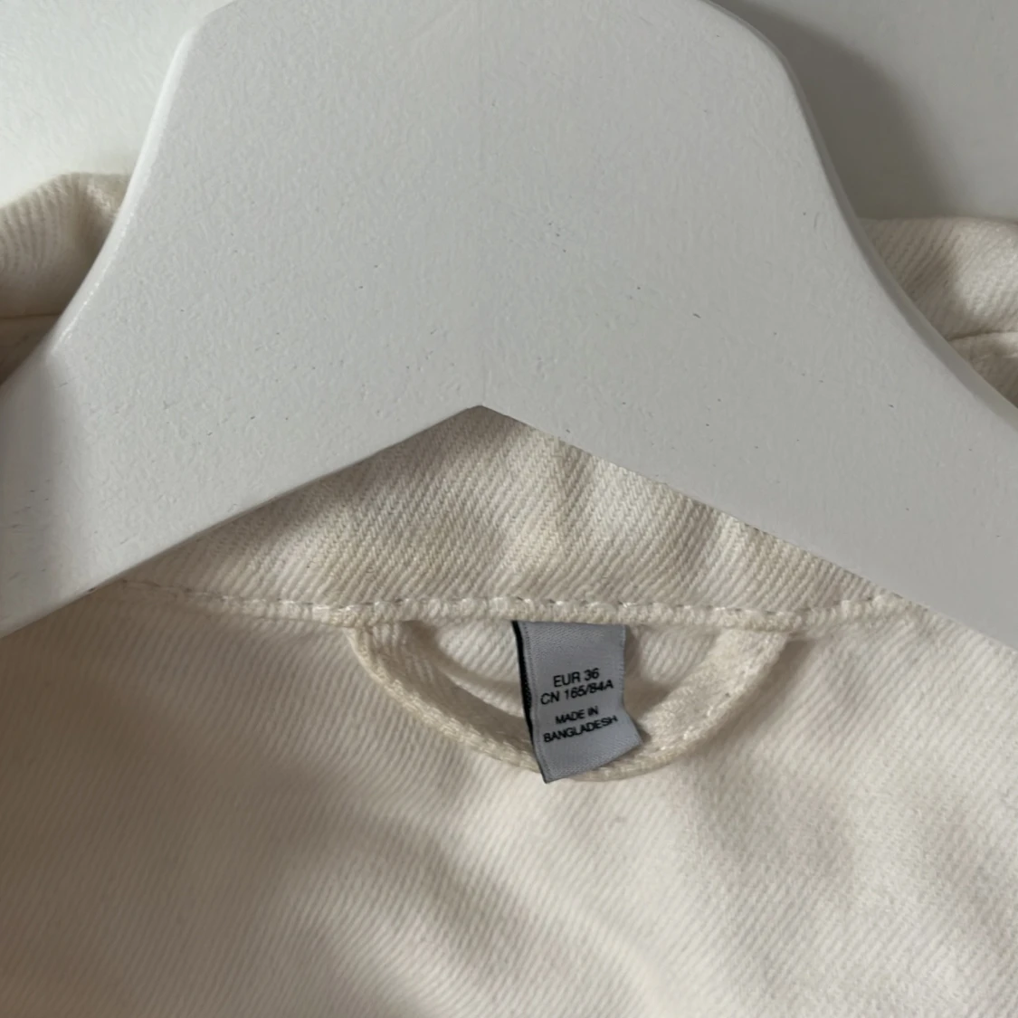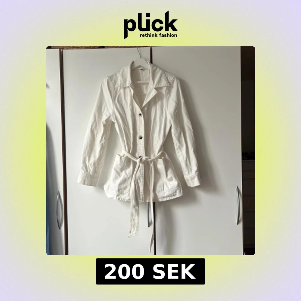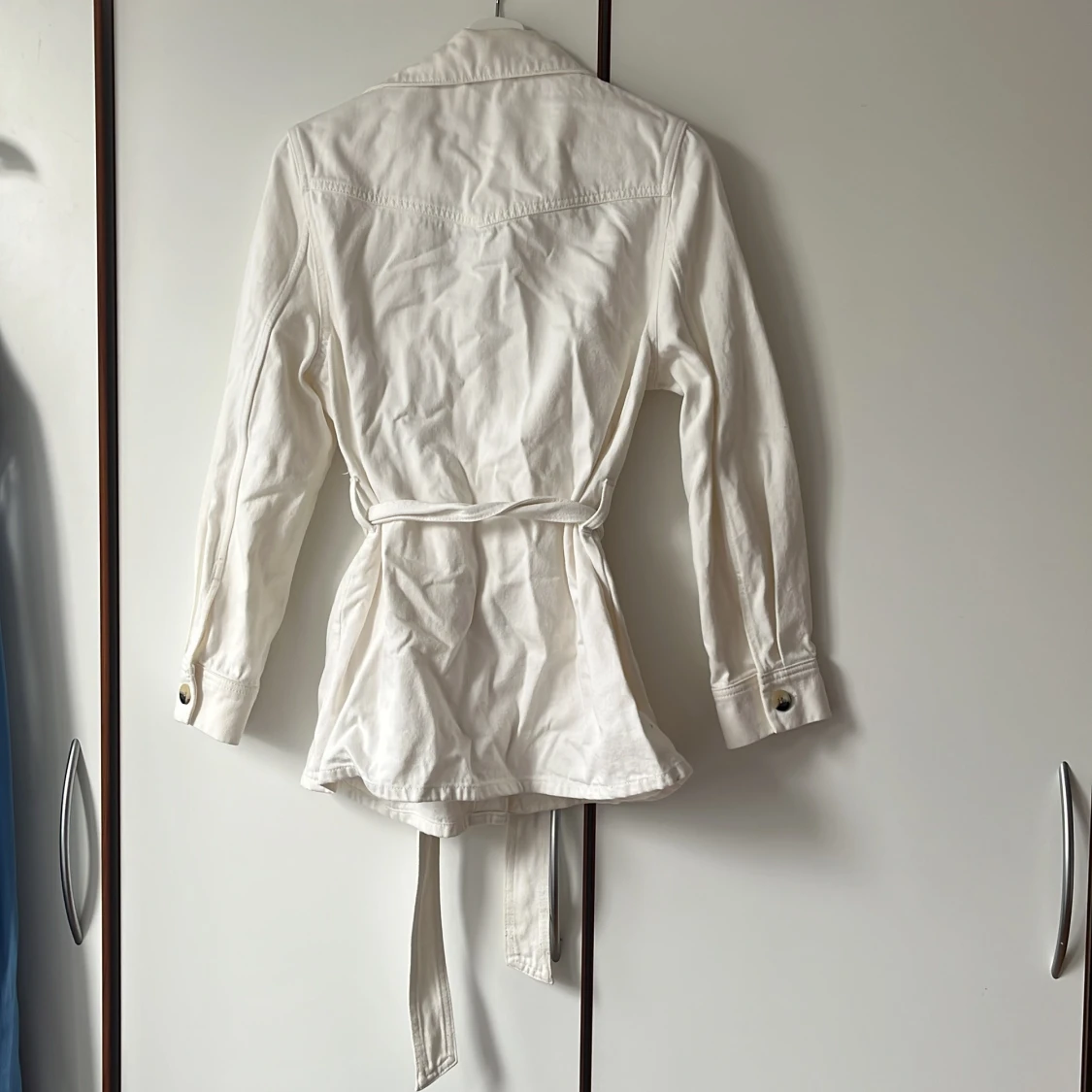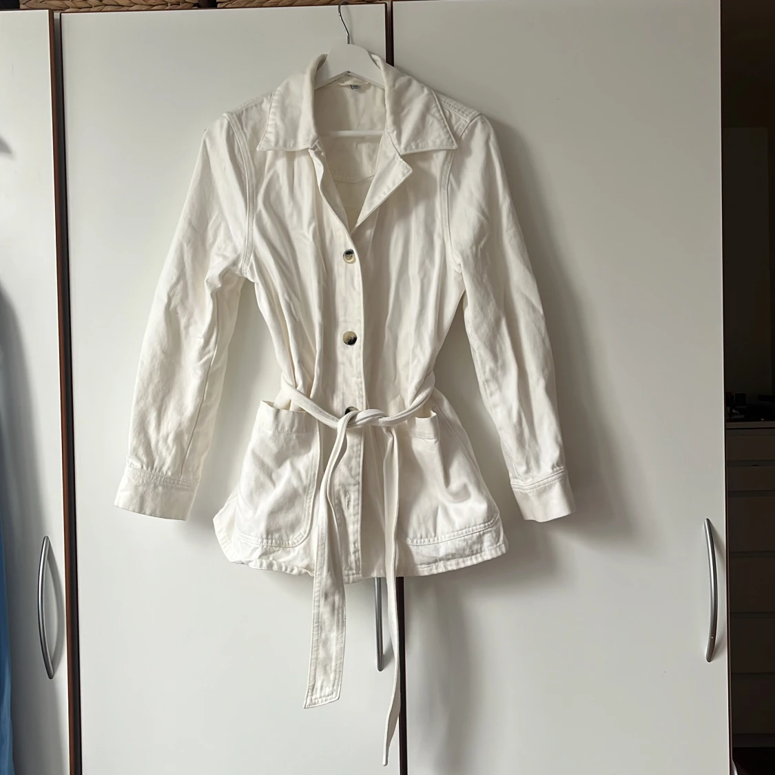 En stilren, fin, vit jacka från & Other Stories i 100% bomull. Jackan har klassisk krage, knappar framtill, två stora fickor, långa ärmar med knappdetalj och ett matchande bälte i midjan.