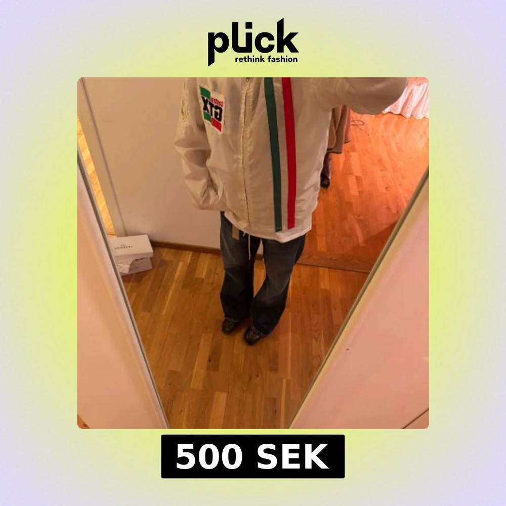 Säljer en cool vit jacka med Castrol GTX-tryck och färgglada ränder i rött och grönt. Jackan har en broderad detalj på ärmen med texten 'Rally Marshals Association'. Perfekt för bilentusiaster!