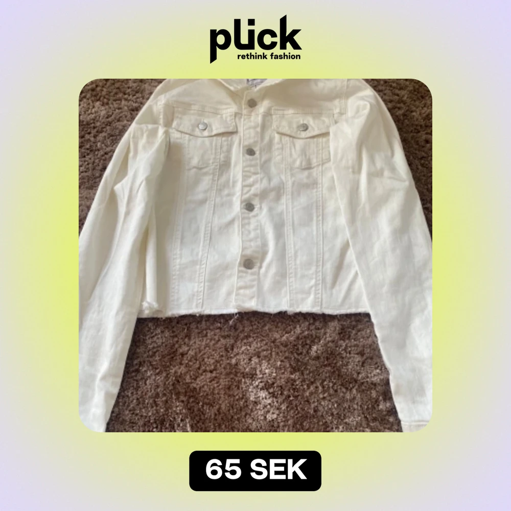 Jätte söt vit jeans jacka som inte används längre då den börjar bli för liten. Den har en liten fläck på armen som visas på sista bilden annars är den i jätte fint skick. Den är normal i sin storlek.
