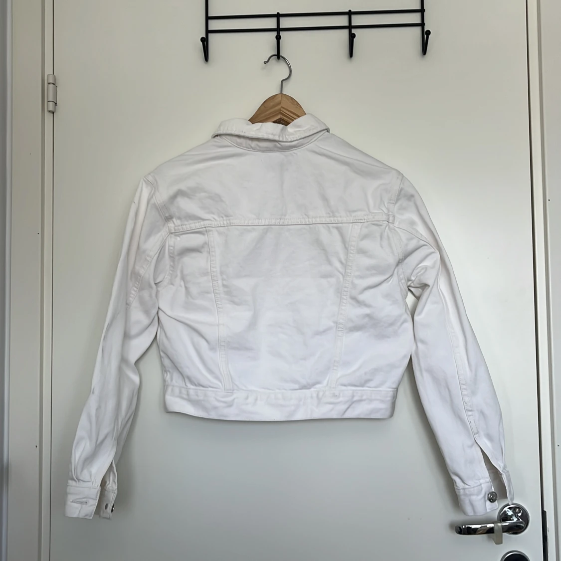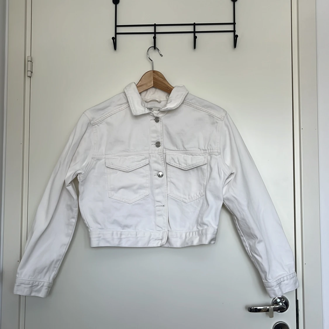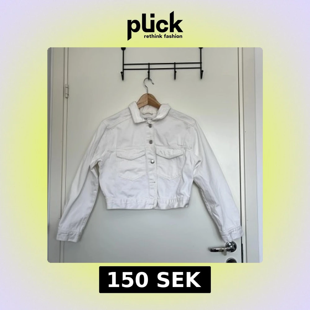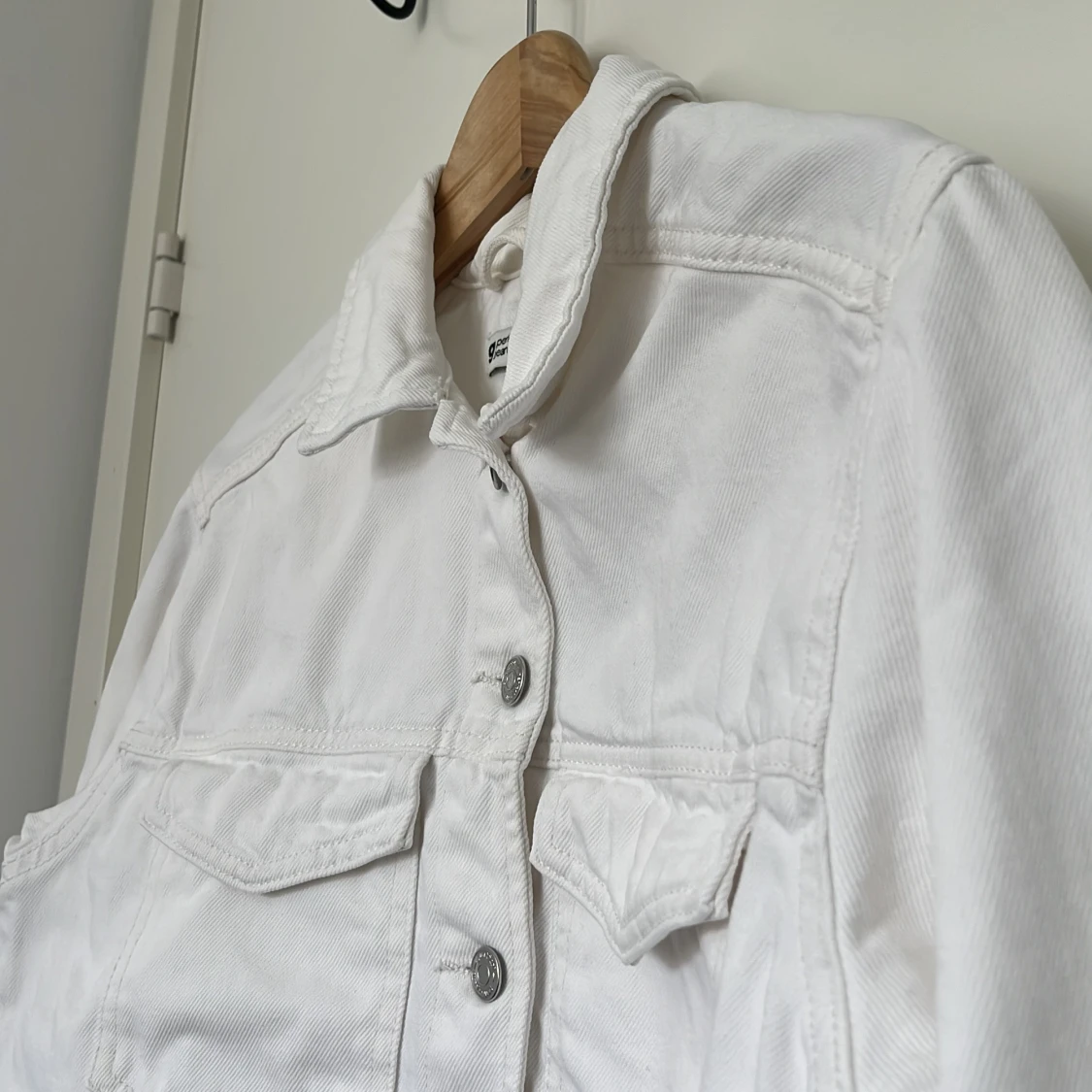 Vit jeansjacka från Gina Tricot i storlek XS. Klassisk modell med två bröstfickor med lock, silvriga knappar och krage. Jackan är croppad och har långa ärmar, inga missfärgningar.
