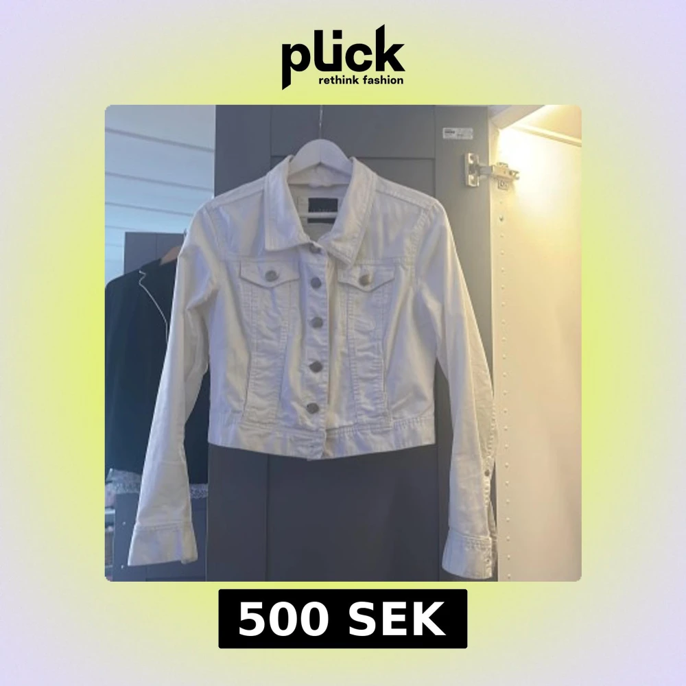 Snygg vit jeansjacka från Lindex i storlek 40. Klassisk modell med krage, knappar framtill och två bröstfickor med lock. Jackan har långa ärmar och markerad midja för en fräsch och stilren look. Perfekt till vår och sommar!