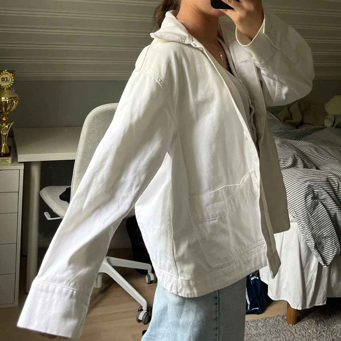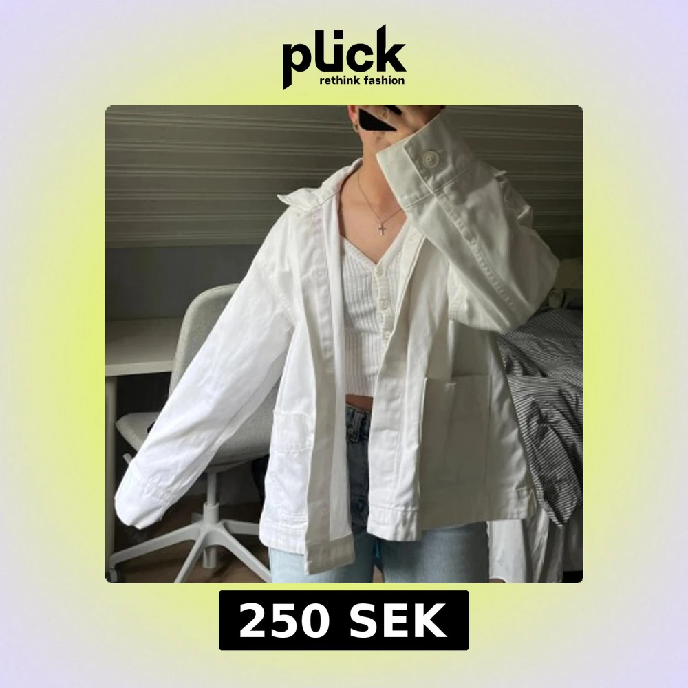 Säljer en vit oversized jeansjacka från Weekday. Jackan har lång ärm, rak passform och stängs med knappar. Ytterst sällan använd🤍