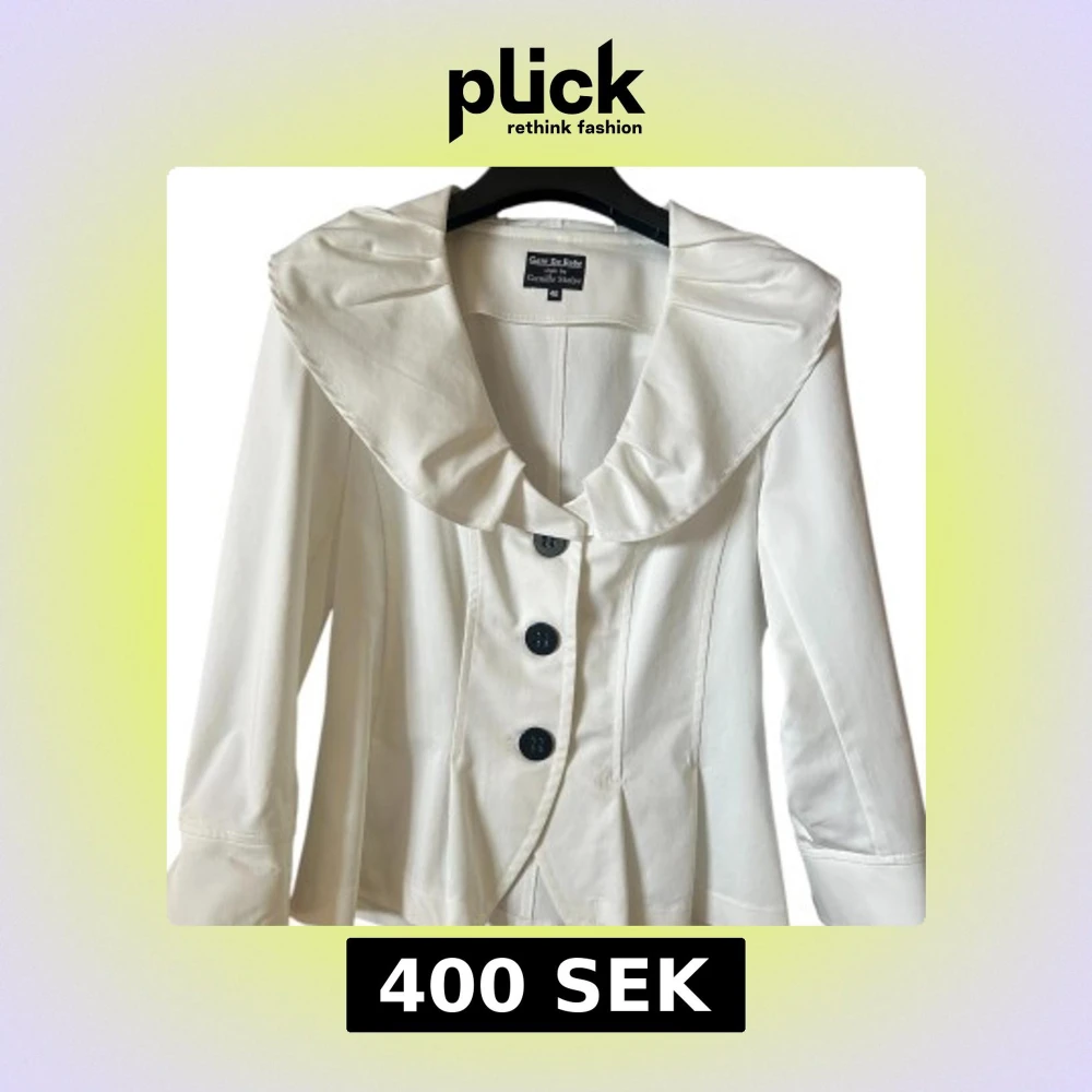 Elegant vit kavaj från Gare De Robe. Kavajen har en unik krage och stora svarta knappar framtill. Den är långärmad och har en figursydd passform som ger en stilren look. Perfekt för att lyfta vilken outfit som helst.