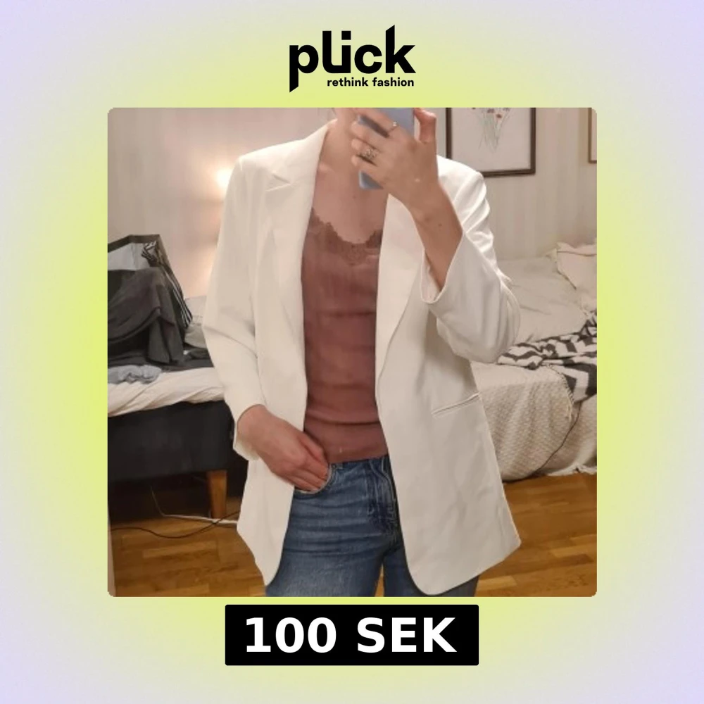 Säljer en stilren vit kavaj från H&M i storlek 40. Kavajen har en klassisk design med dekorativa fickor och har endast andvänts en gång. Denna gång lyckades den däremot få några små fläckar som jag gärna skickar bild på ifall du önskar. Fläckarna är små så det var svårt att få med bild på dem😊