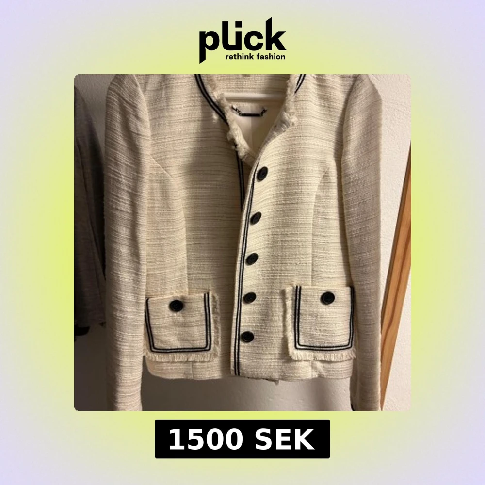 Snygg vit kavaj från Karl Lagerfeld Paris med svarta knappar och svarta detaljer längs kanterna. Jackan har två fickor framtill med dekorativa knappar och fransade kanter vid kragen. Tillverkad i ett strukturerat tyg som ger en exklusiv känsla.