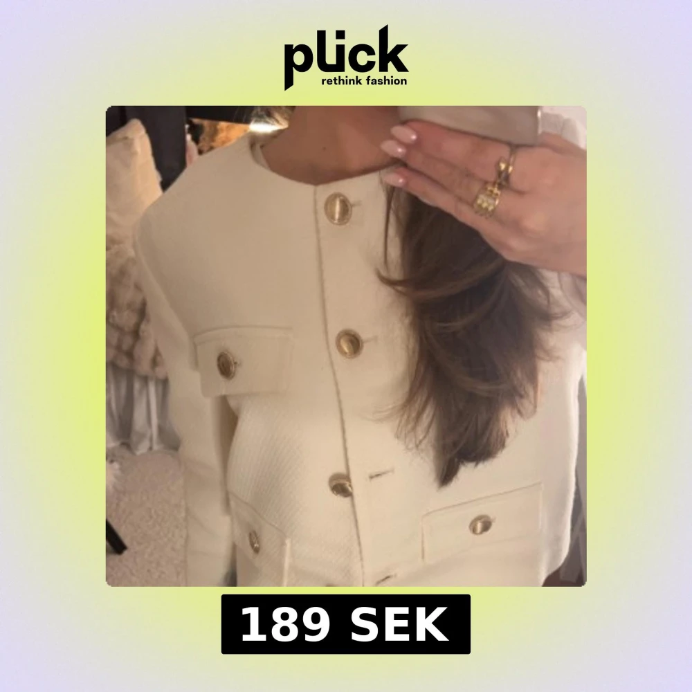 Säljer en stilren vit kavajjacka från Zara med rund halsringning och snygga guldknappar framtill. Jackan har fyra fickor med lock och är tillverkad i ett strukturerat tyg som ger en exklusiv känsla. Perfekt för dig som gillar klassisk och chic stil.