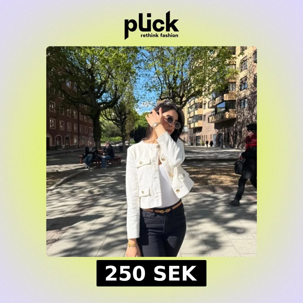 Säljer en snygg vit kavajjacka med guldknappar och fickdetaljer framtill. Jackan är croppad och har lång ärm, perfekt för att lyfta en outfit. Klassisk och stilren design som passar till mycket.