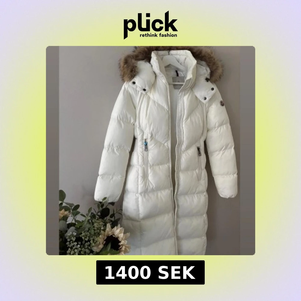 Snygg lång vit dunjacka från Moncler med avtagbar huva och lyxig pälskant. Jackan har markerad midja med bredt bälte där Moncler-loggan är broderad, dragkedja framtill och flera fickor med dragkedja, jackan är i nyskick då jag endast haft den 1 kort tillfälle men kände den blev förstor för mig , jackan är i strl 0 som motsvarar en xs men denna är större i strl så skulle säga en small kan ha denna även en liten M om man inte har en jätte stor byst