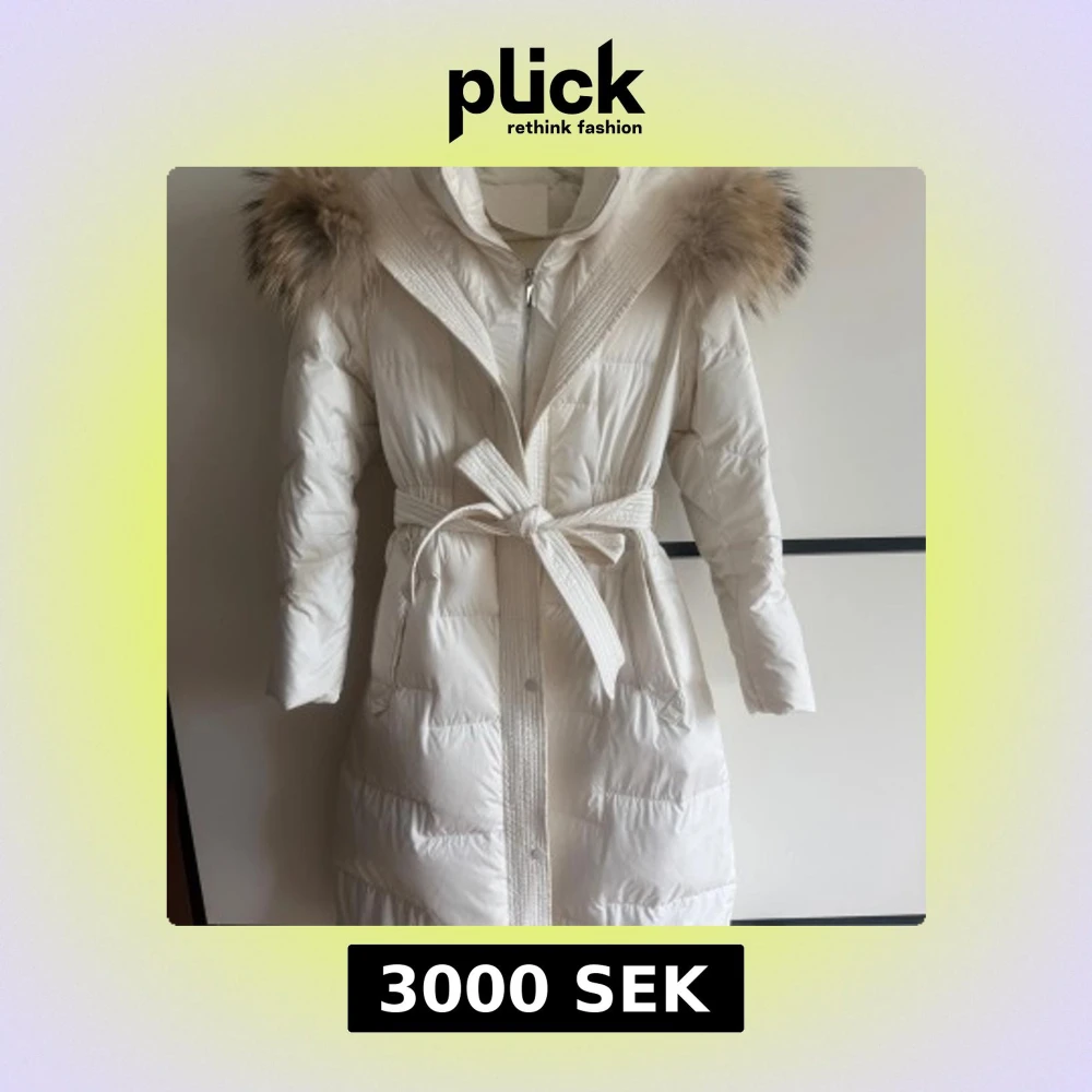 En snygg lång vit dunjacka med fluffig brun äkta pälskrage och bälte i midjan. Jackan har dragkedja framtill, knappar och quiltad design. Perfekt för kalla vinterdagar när du vill hålla stilen och den kommer definitivt att hålla värmen. Endast använd en vinter och ca använd 10ggr. Figursydd i strl XS men passar min strl som är S. Köpt för 4000kr, pris kan diskuteras. Exklusive frakt gäller för varan.