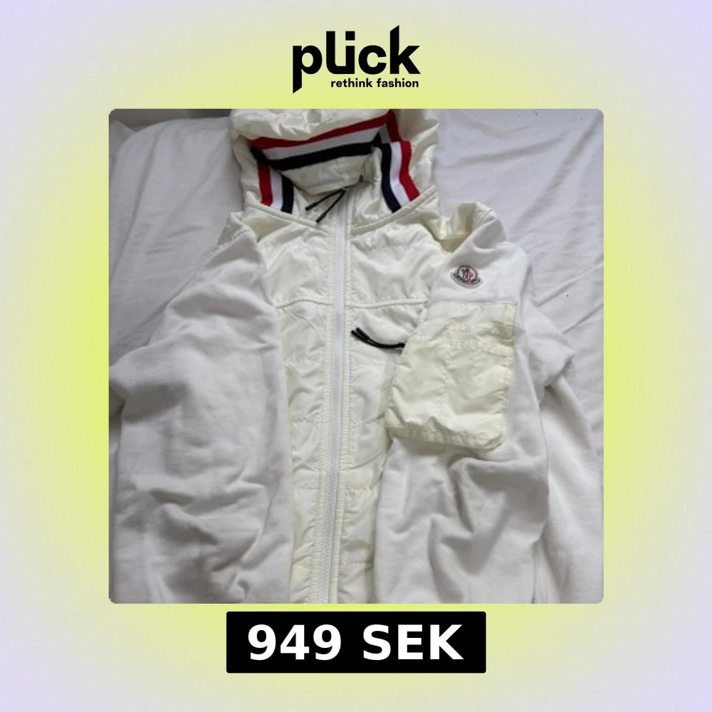 Säljer en stilren vit pufferjacka från Moncler med huva och dragkedja. Jackan har Moncler-logga på ärmen, ficka med dragkedja på armen och ribbade muddar med röd, vit och marinblå rand. Materialmix av polyester och bomull, perfekt för dig som vill ha en clean look.
