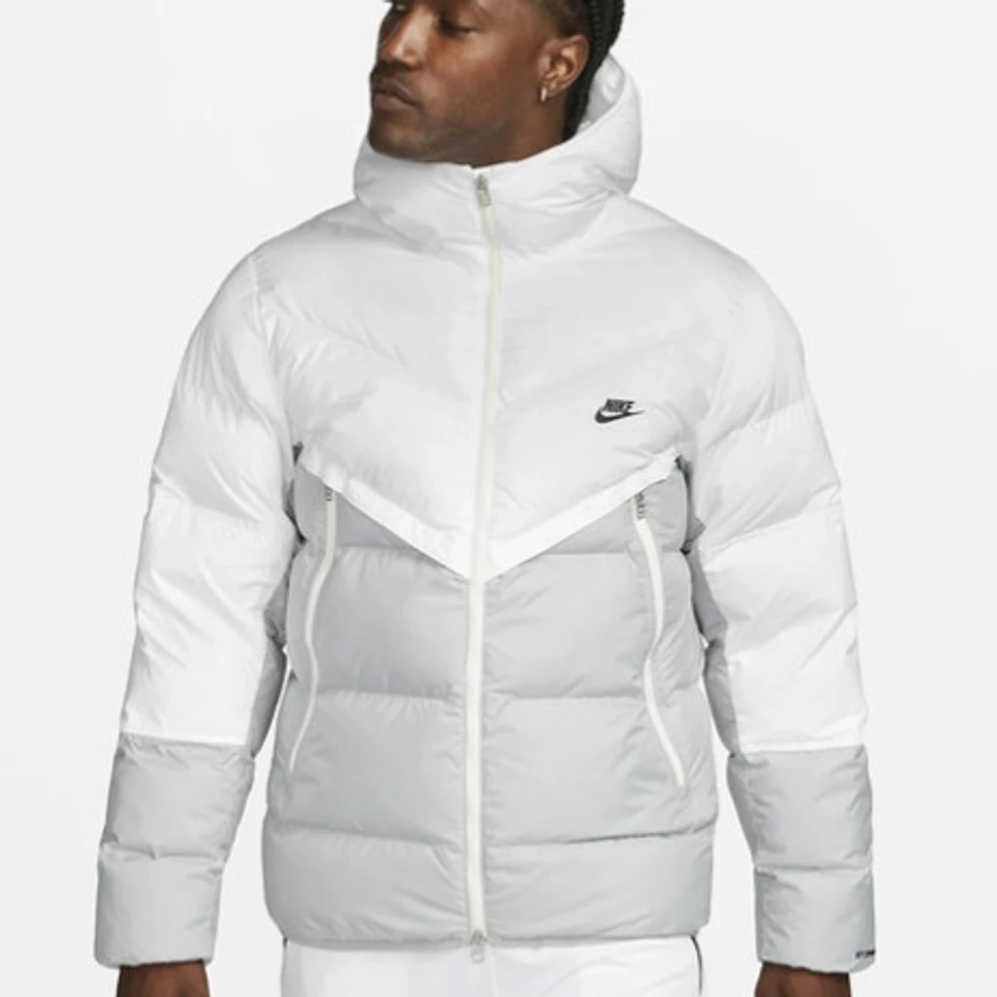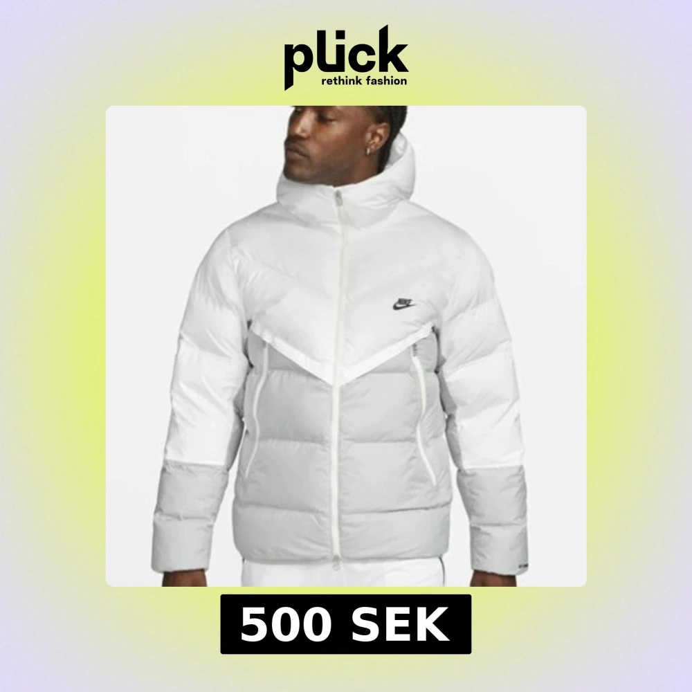 Säljer en snygg vit och grå dunjacka från Nike. Jackan har en hög krage och dragkedja framtill. Den är perfekt för kyliga dagar och har en stilren design med Nike-loggan på bröstet.
