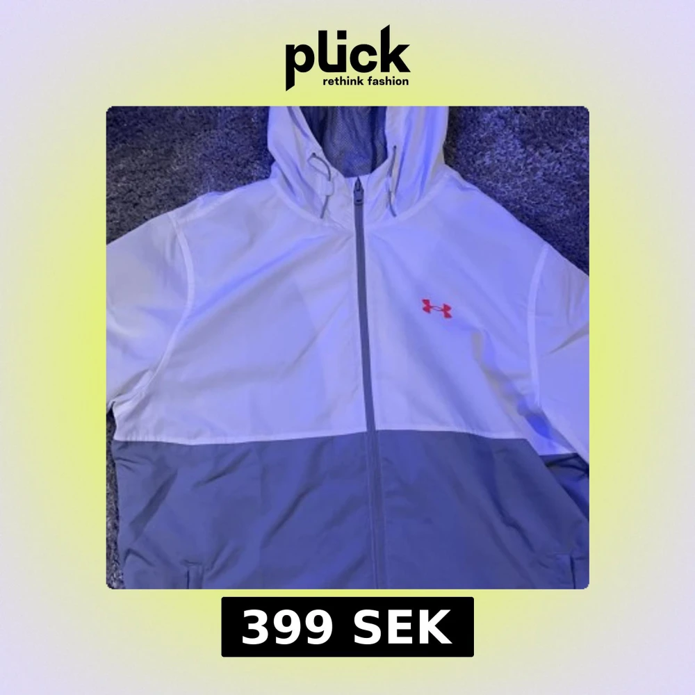 Jackan är L men passar även M, Snygg vindjacka från Under Armour i vitt och grått med huva och dragkedja. Perfekt för blåsiga dagar. Den har en röd logotyp på bröstet och en praktisk design.
