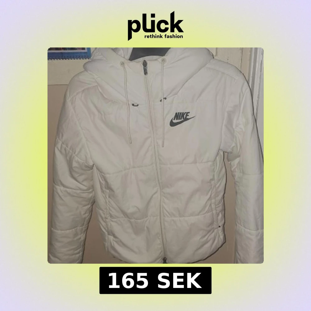 Snygg vit pufferjacka från Nike med svart logga på bröstet. Jackan har huva med snörning, dragkedja framtill och quiltad design. Perfekt för kyliga dagar och ger en sportig vibe.