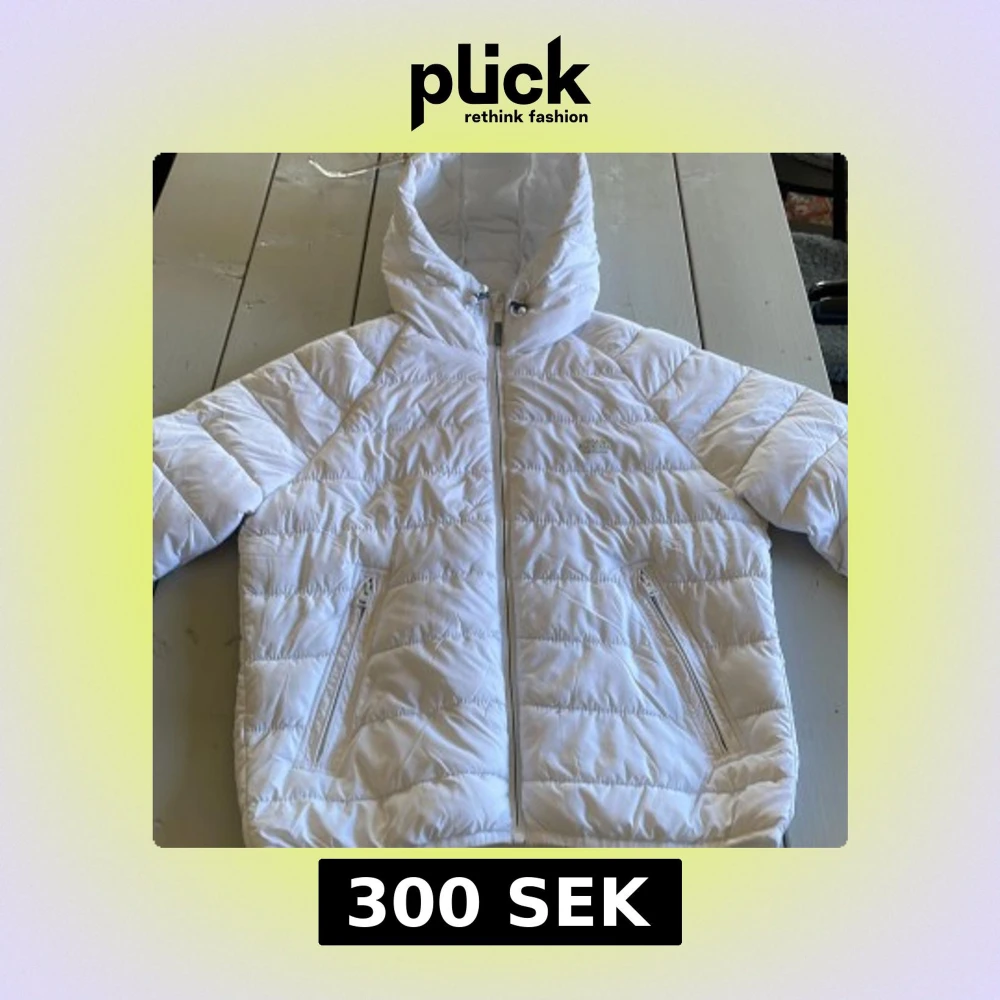 Säljer en snygg vit pufferjacka från Permanent Services. Jackan har en dragkedja framtill och två praktiska fickor med dragkedjor. Den är quiltad och har en huva för extra värme. Perfekt för kyliga dagar! Skinande ren å hel