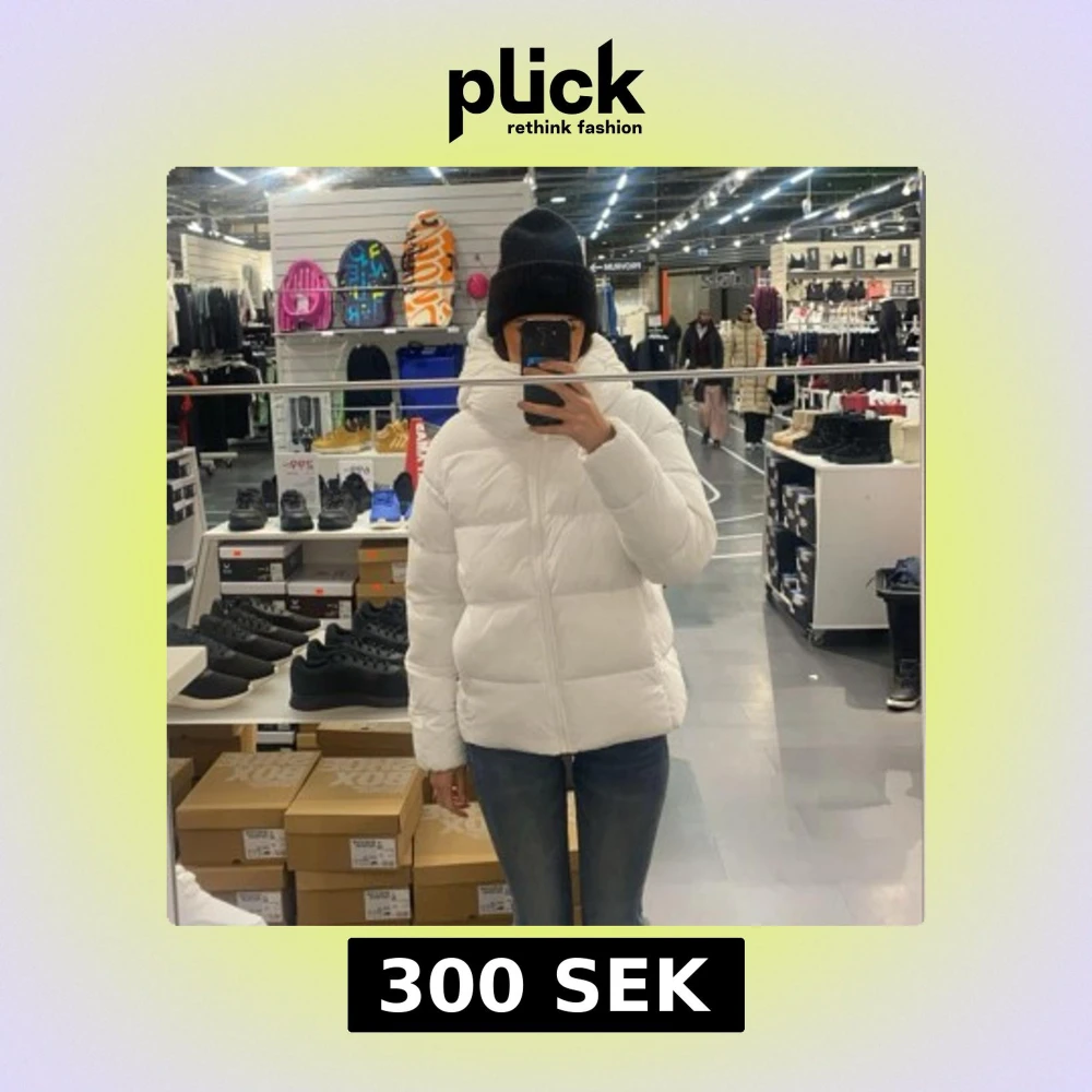Säljer en riktigt snygg vit pufferjacka med hög krage och huva. Jackan har en clean look med dragkedja framtill. Liten sminkfläck vid kragen. Artikel nummer: 397061