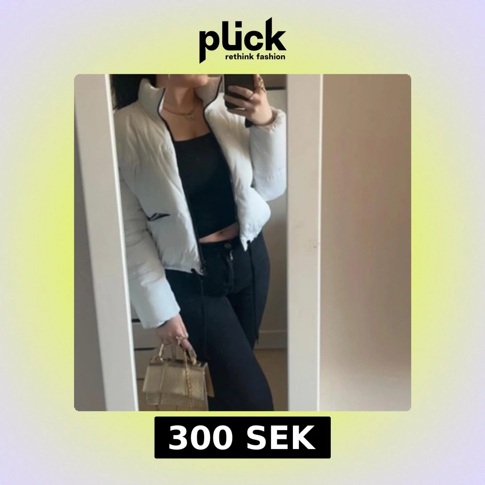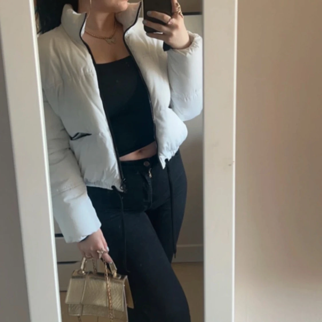 Säljer en snygg vit pufferjacka med dragkedja och hög krage. Jackan har en kortare passform och är perfekt för kyligare dagar. Den är stilren och lätt att matcha med olika outfits.