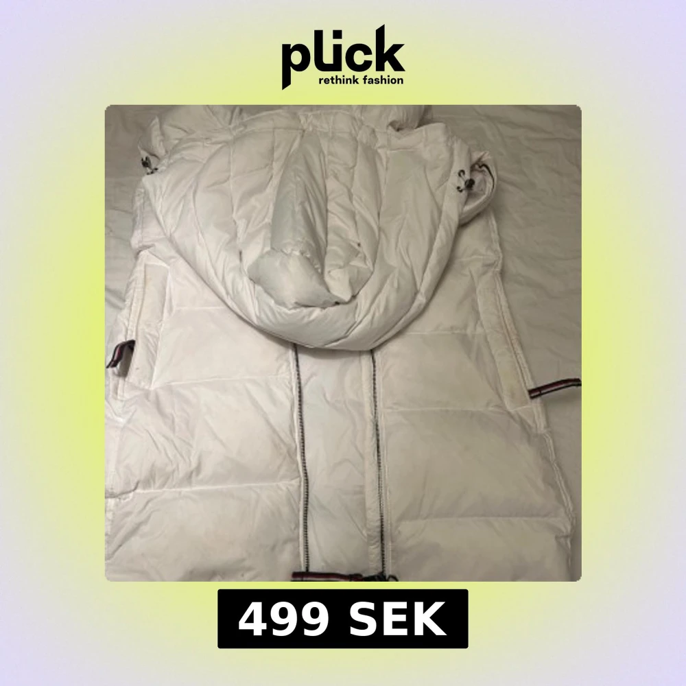 Säljer en vit pufferjacka från Tommy Hilfiger med huva och coola detaljer i rött, vitt och marinblått på muddar och fickor. Jackan har tvåvägsdragkedja och är tillverkad i polyester, perfekt för kalla dagar. Klassisk och sportig look med snygga Hilfiger-ränder.