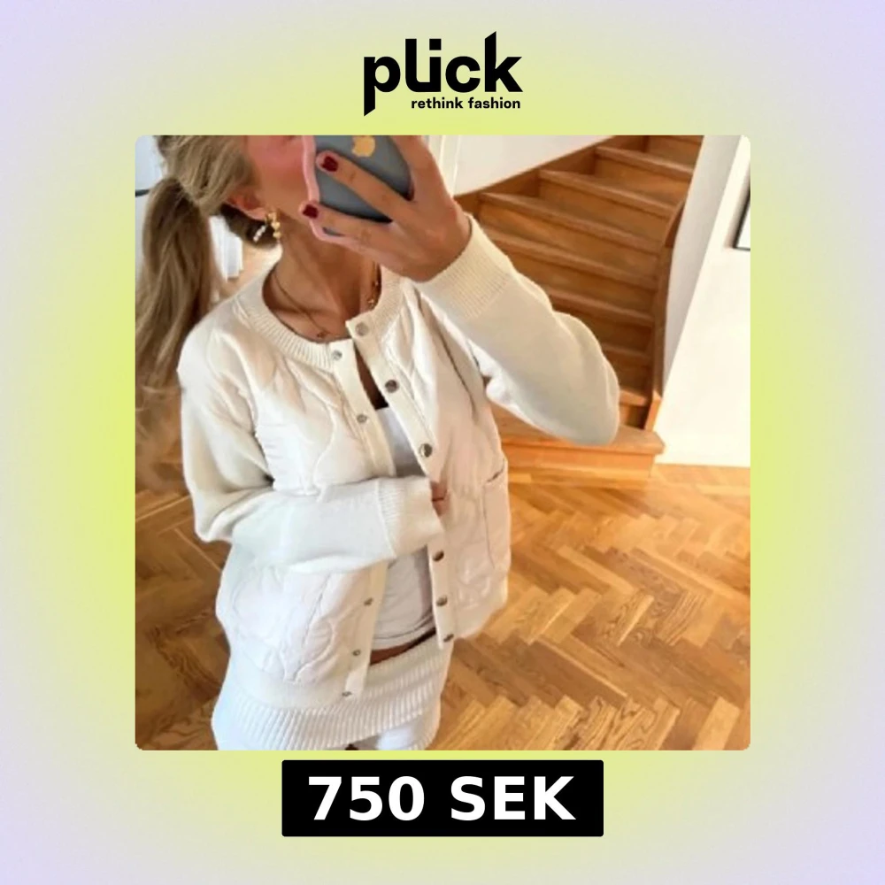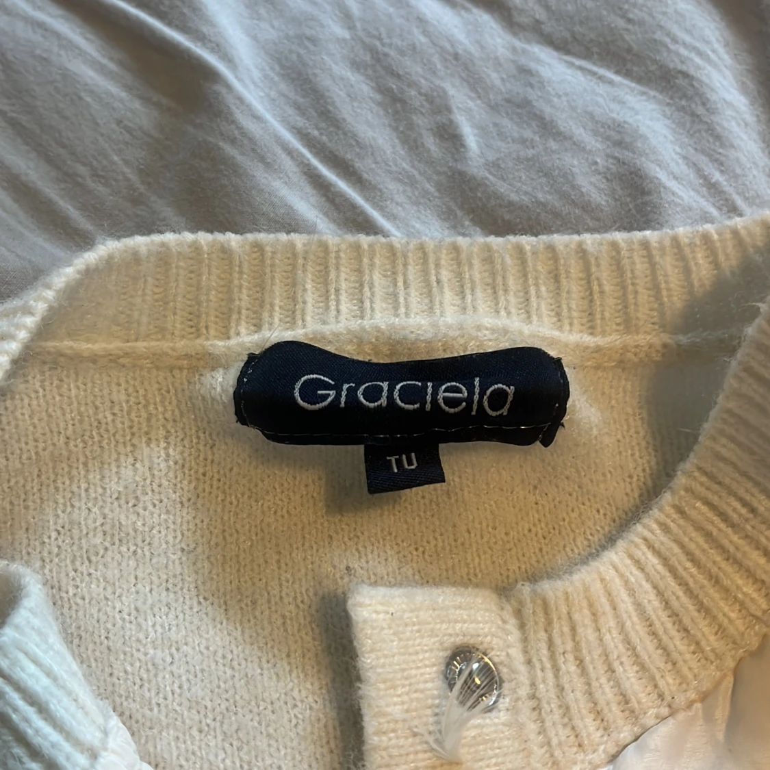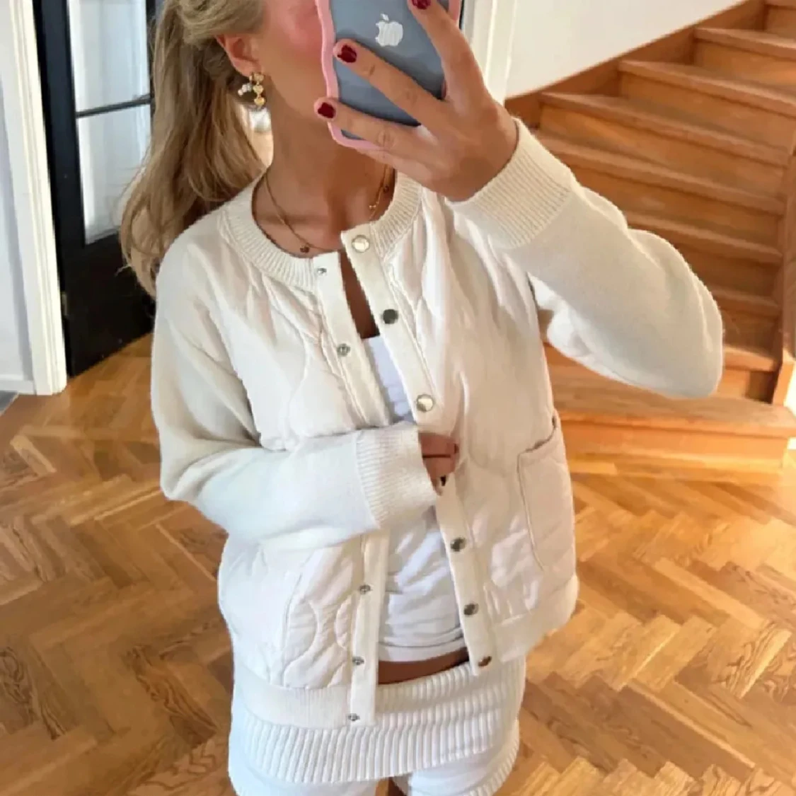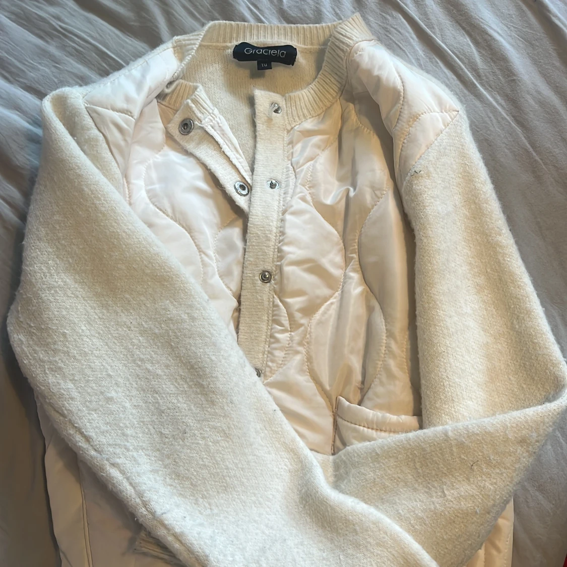 Säljer en vit cardigan jacka från Graciela med quiltad framsida och stickade ärmar. Jackan har rund halsringning, knappar framtill och ribbade muddar. Perfekt för lager-på-lager och en clean look.