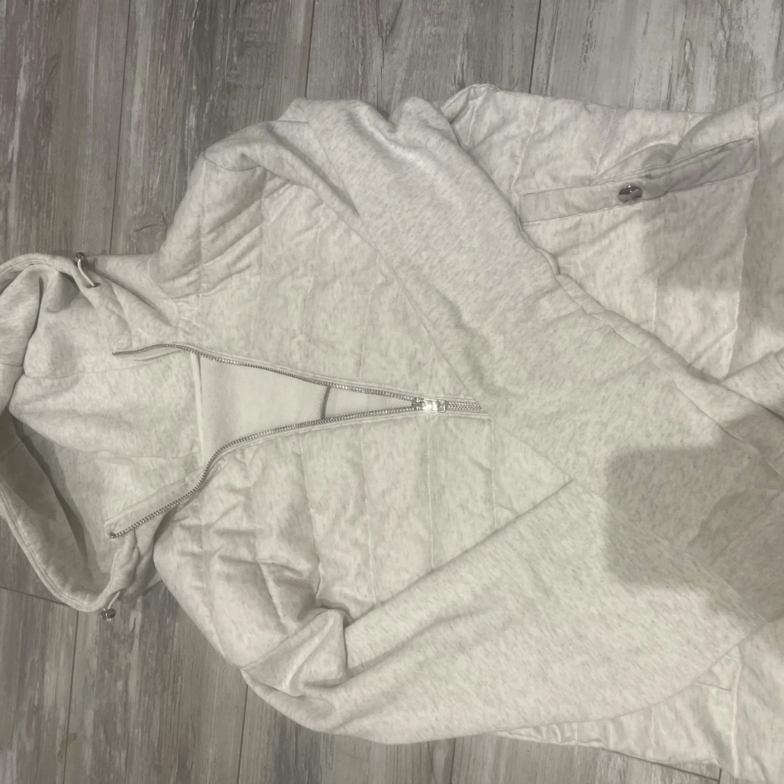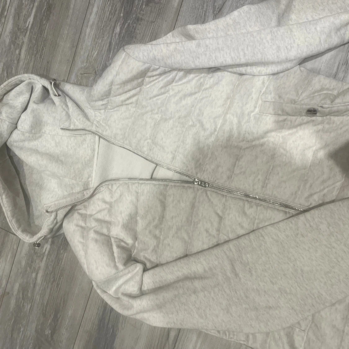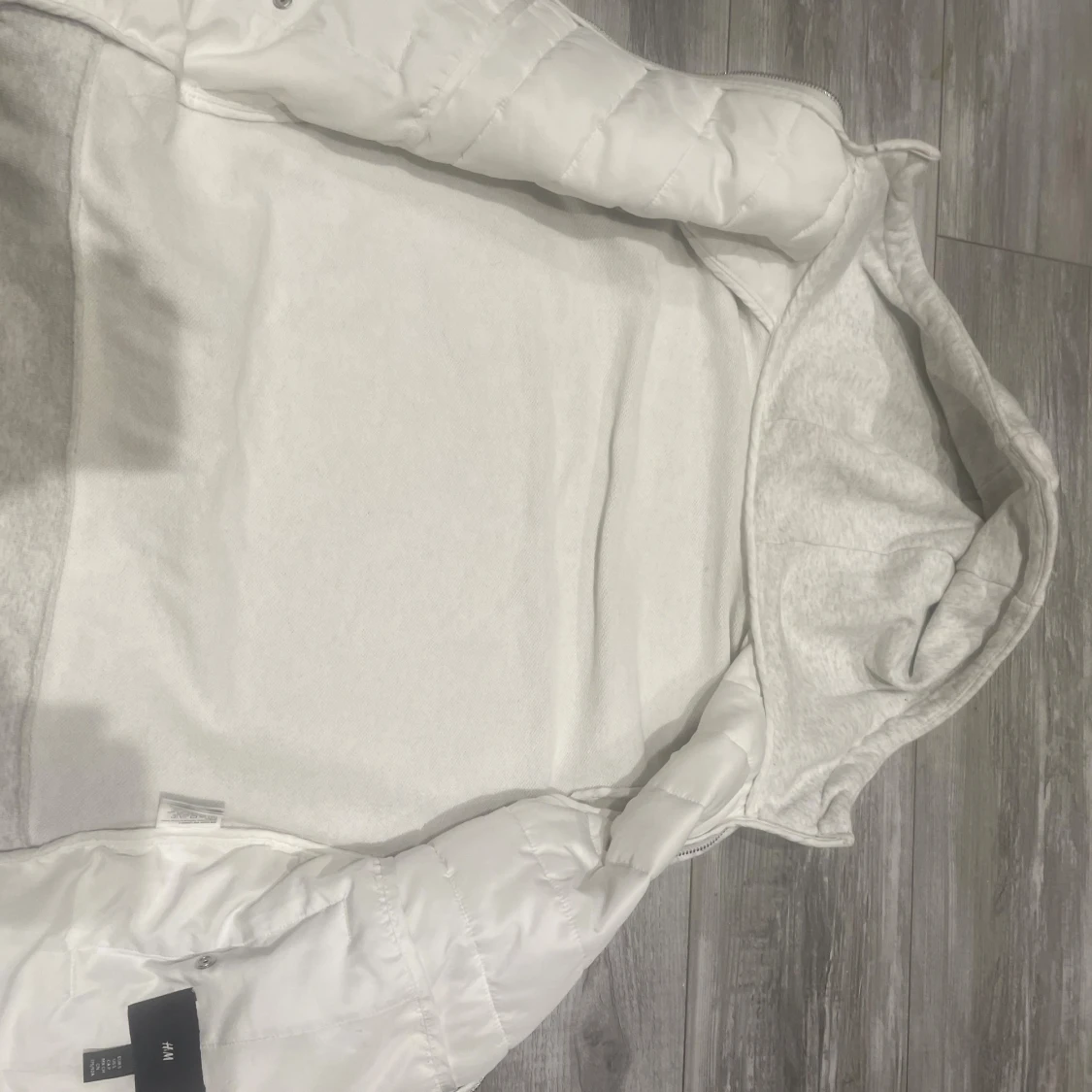 Snygg vit pufferjacka från H&M med quiltade partier och huva. Jackan har dragkedja framtill och sidofickor med knapp. Perfekt för kyliga dagar och enkel att matcha med olika outfits.