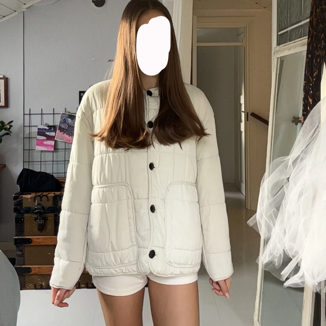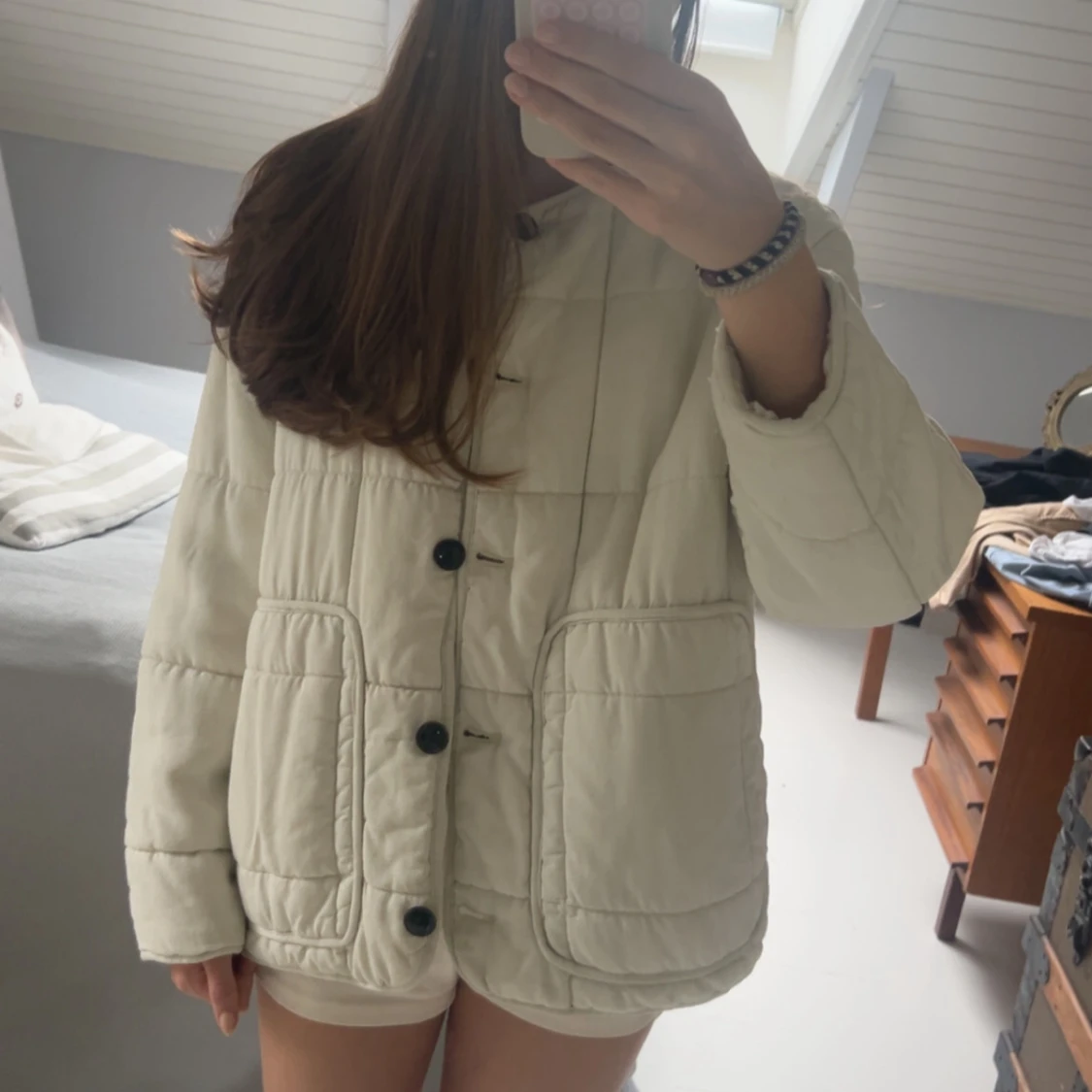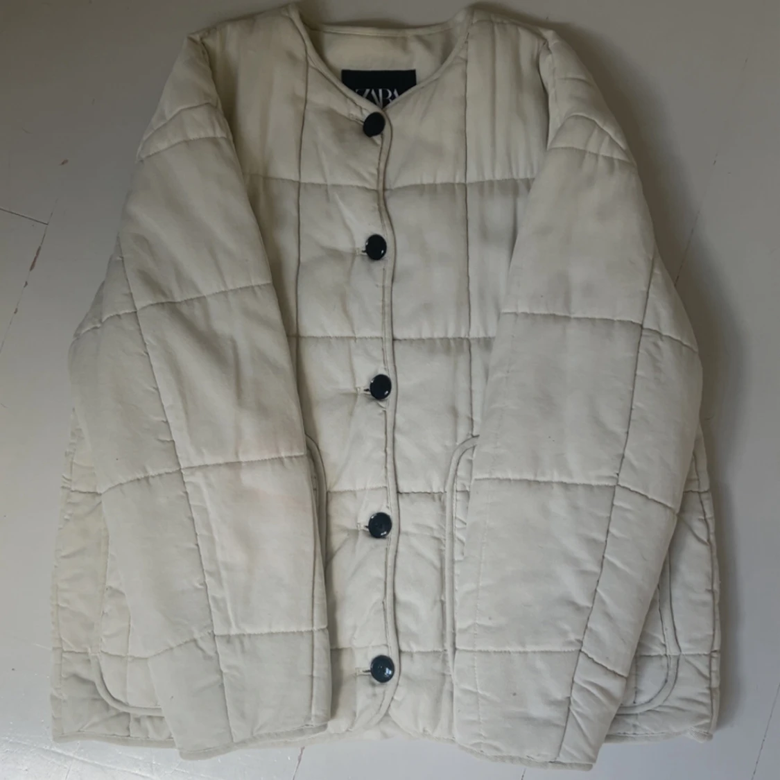 Quiltad pufferjacka från Zara i ljusvit färg med svarta knappar framtill. Jackan har två stora fickor, rund hals och långärmad passform. Perfekt för dig som gillar en clean och chill stil. Materialet är mjukt och känns skönt mot huden.