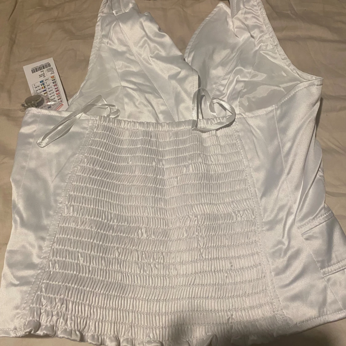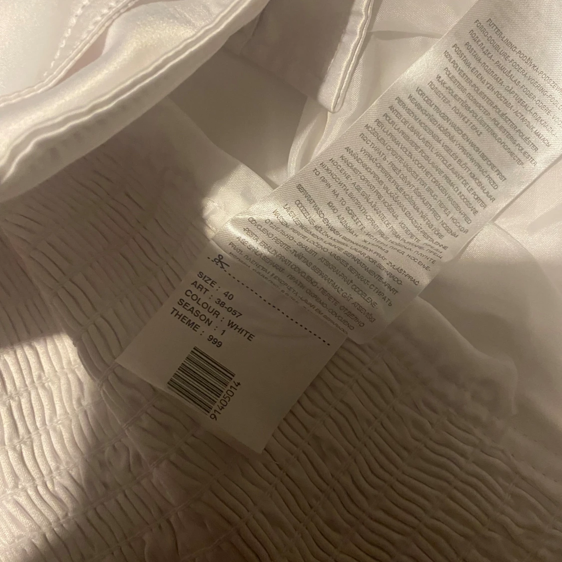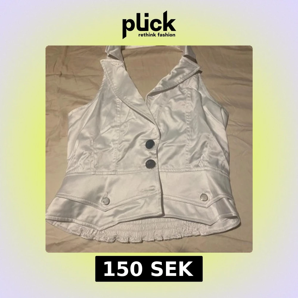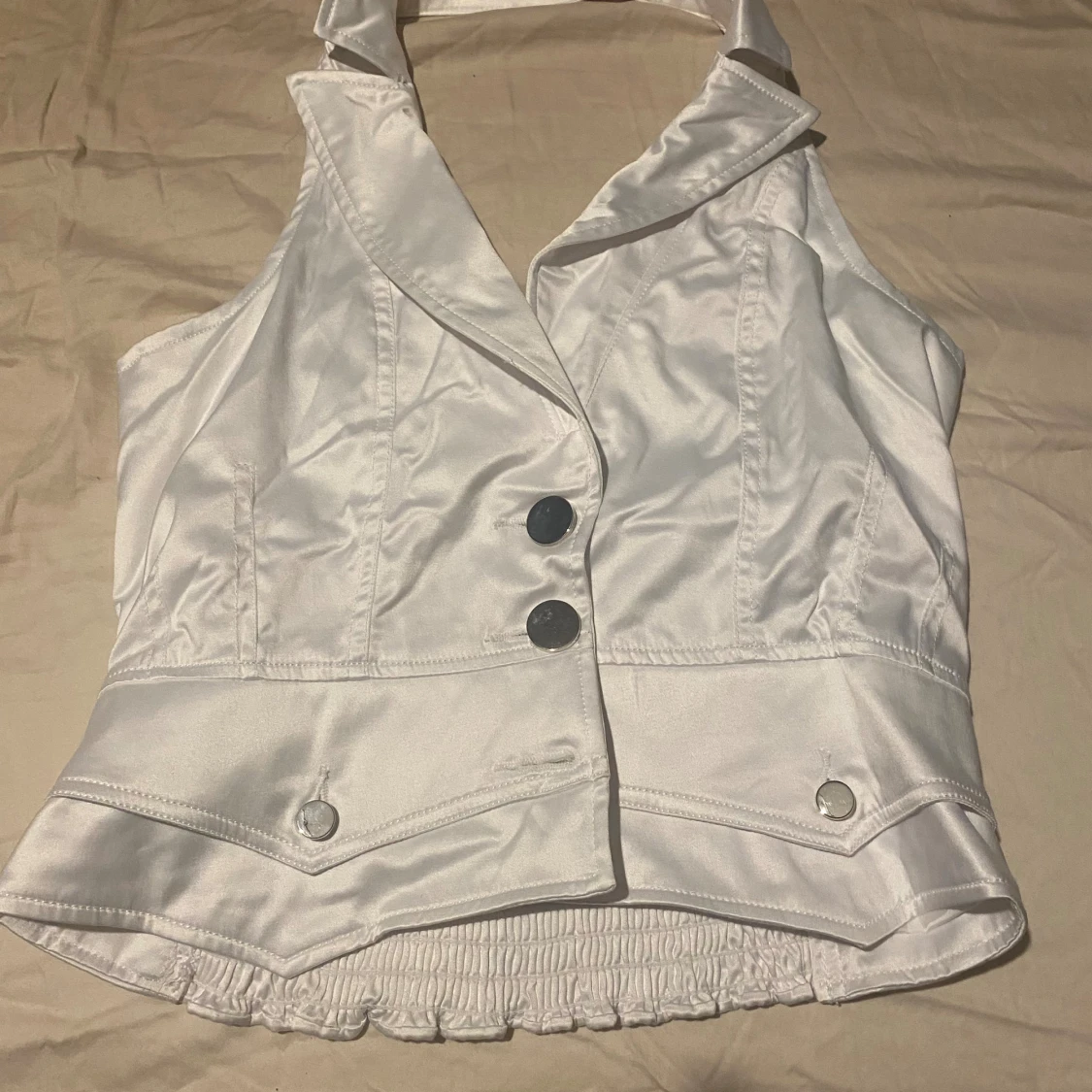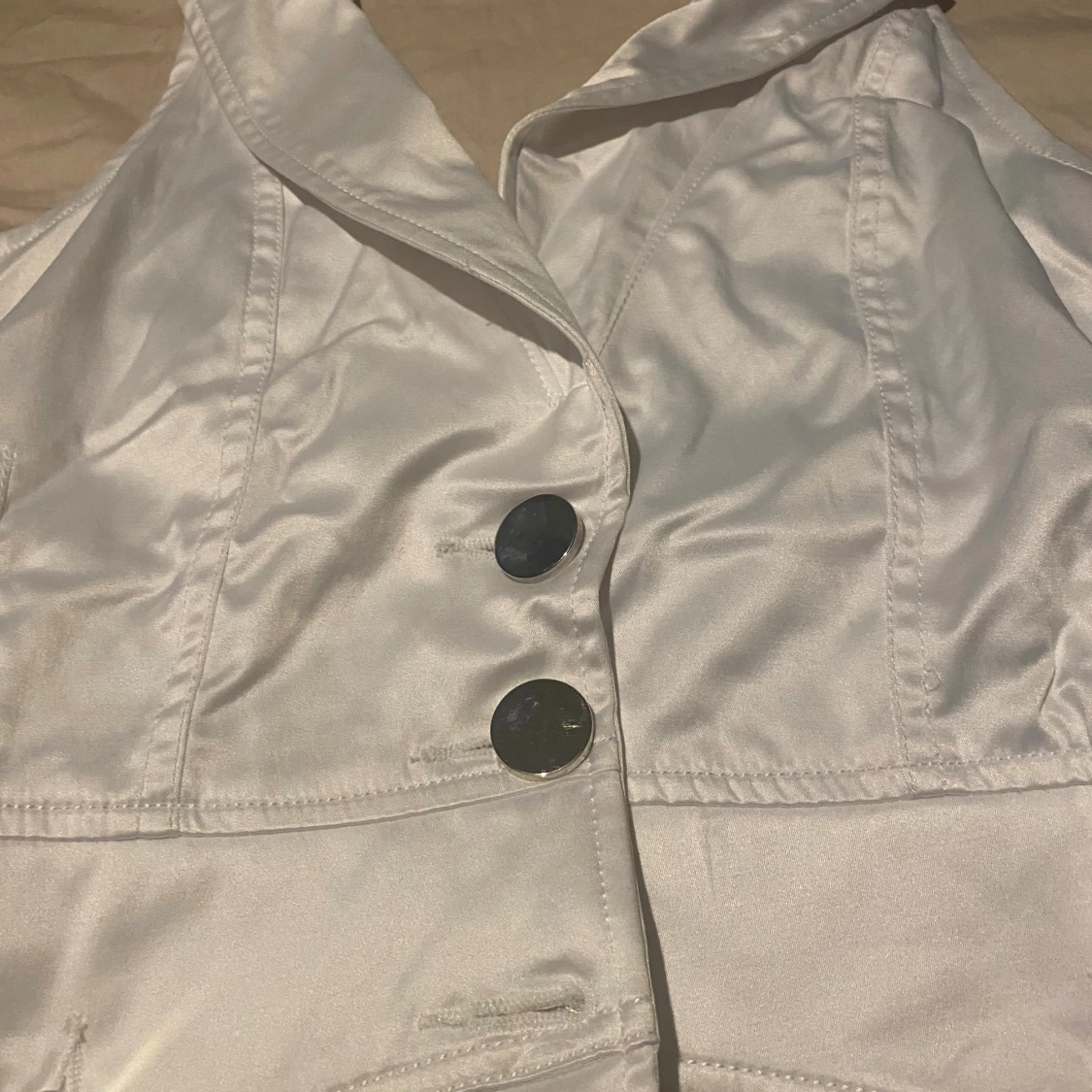 Snygg vit väst i satinliknande material med bred krage och två stora silvriga knappar framtill. Västen har markerad midja, dekorativa fickdetaljer och smockad rygg för extra passform. Perfekt för dig som vill sticka ut med en stilren look.