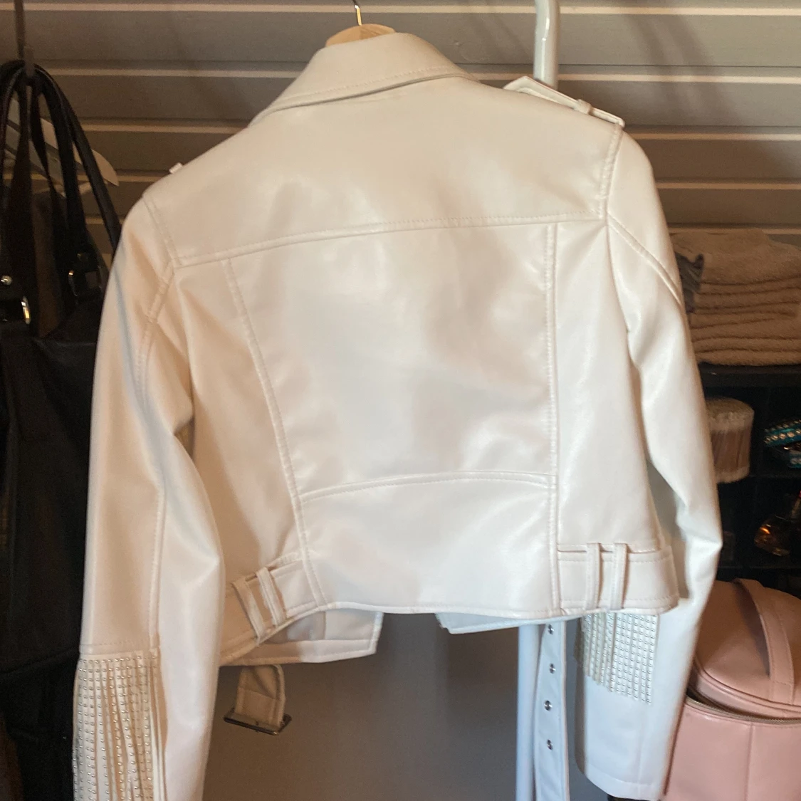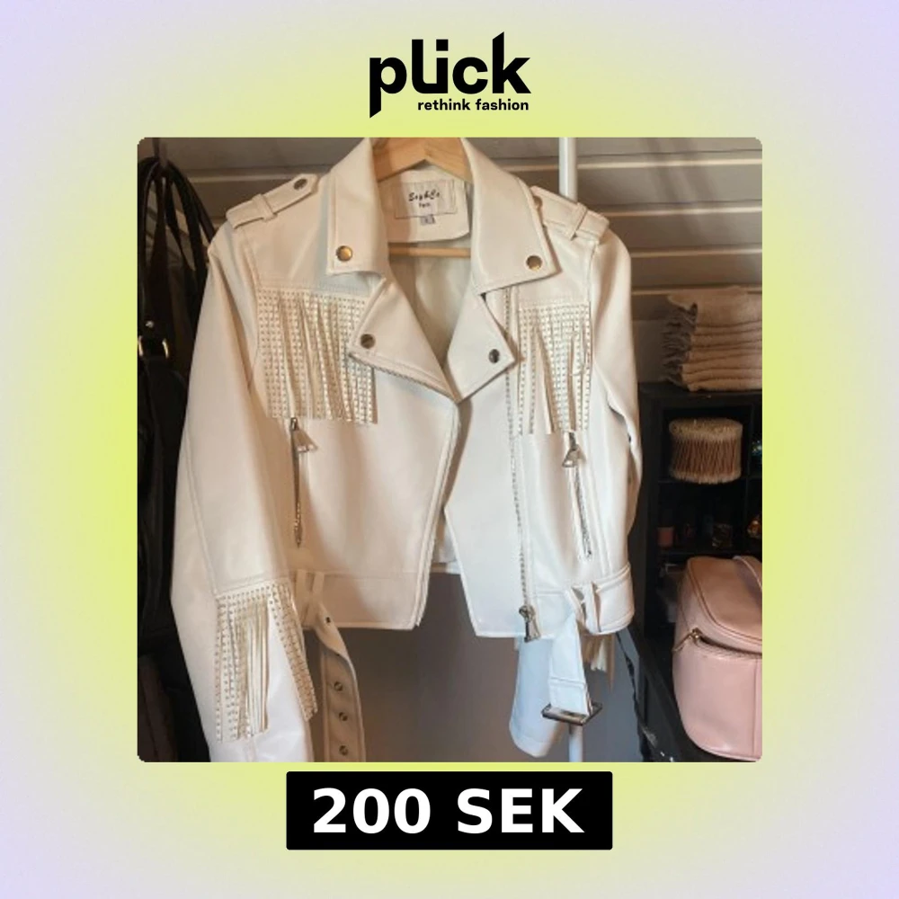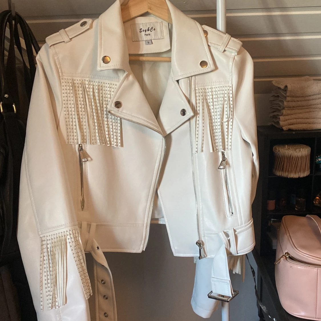 Snygg vit skinnjacka från Soy&Co med coola fransdetaljer och nitar på bröstet och ärmarna. Jackan har dragkedjor, bälte i midjan och axelklaffar. Perfekt för dig som vill sticka ut med en edgy look.