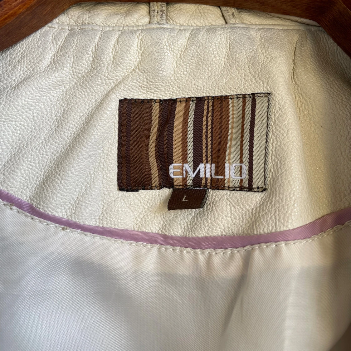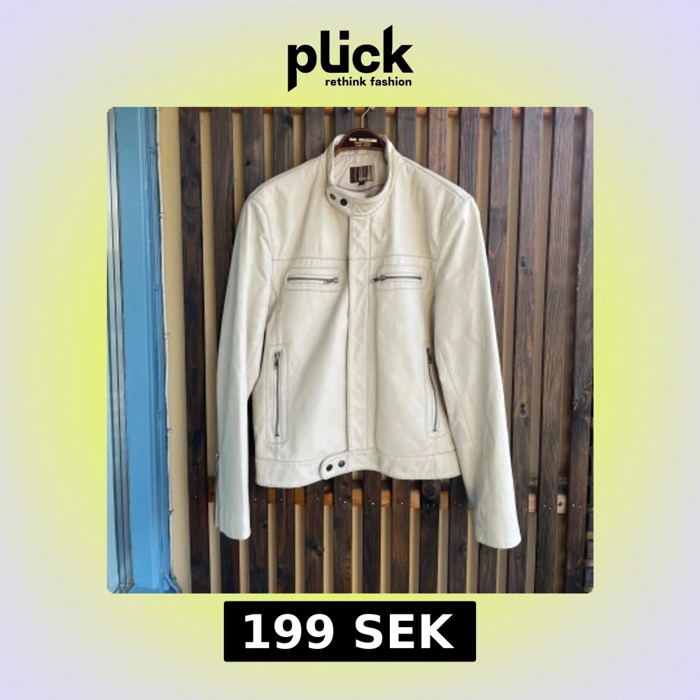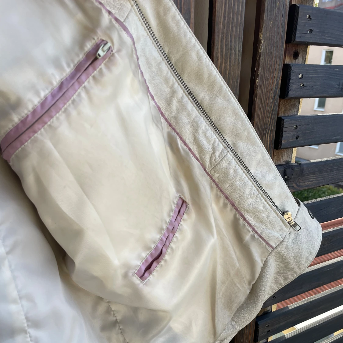 Säljer en stilren vit skinnjacka från Emilio i storlek S. Jackan har ståkrage med tryckknapp, fyra dragkedjefickor framtill och dragkedjor vid ärmsluten. Perfekt för dig som vill ha en clean, slim och snygg look. Bra kvalité trots lite färgändring inuti jackan.