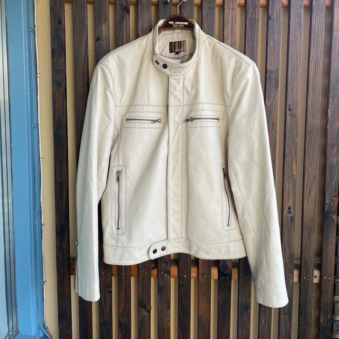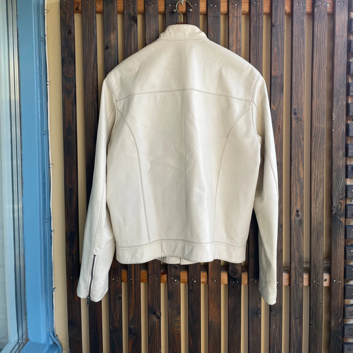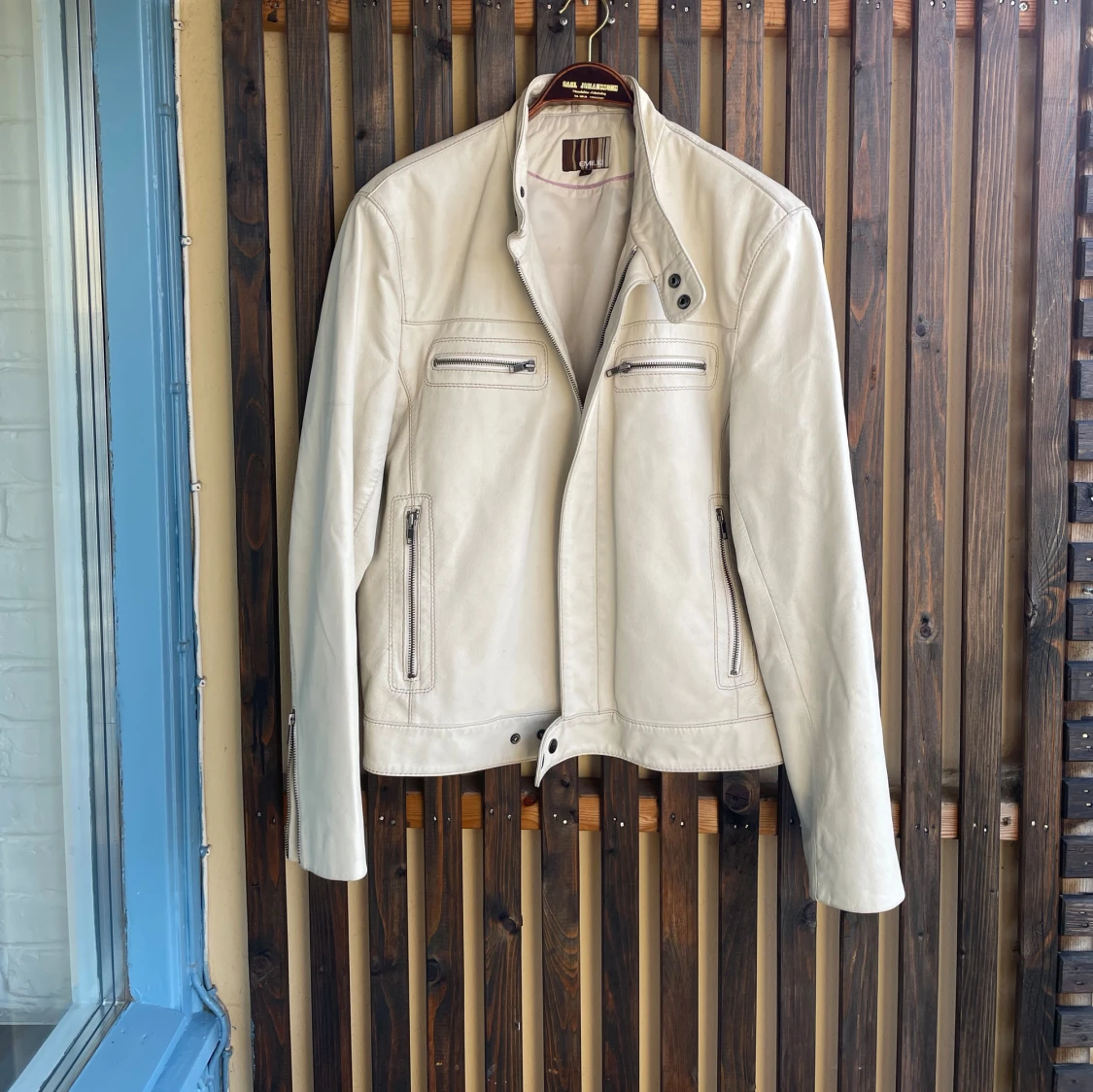 Säljer en stilren vit skinnjacka från Emilio i storlek S. Jackan har ståkrage med tryckknapp, fyra dragkedjefickor framtill och dragkedjor vid ärmsluten. Perfekt för dig som vill ha en clean, slim och snygg look. Bra kvalité trots lite färgändring inuti jackan.