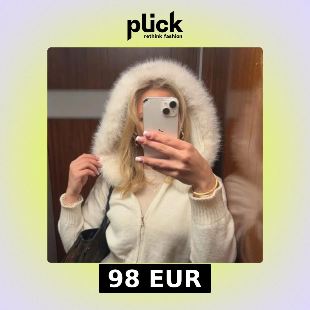 Supermysig vit stickad jacka med fluffig pälskantad luva och dragkedja framtill. Jackan har ribbade muddar och sitter snyggt med en figurnära passform. Perfekt för kalla dagar när du vill vara både varm och stylish.