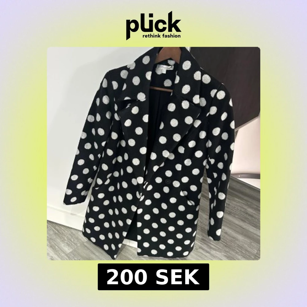 Säljer en svart rock från Oxygen med stora vita prickar. Jackan har klassisk krage, knäppning framtill och två fickor. Perfekt statement-plagg för dig som vill sticka ut. Materialet känns mjukt och har en ull-liknande känsla. Långärmad och rak passform.