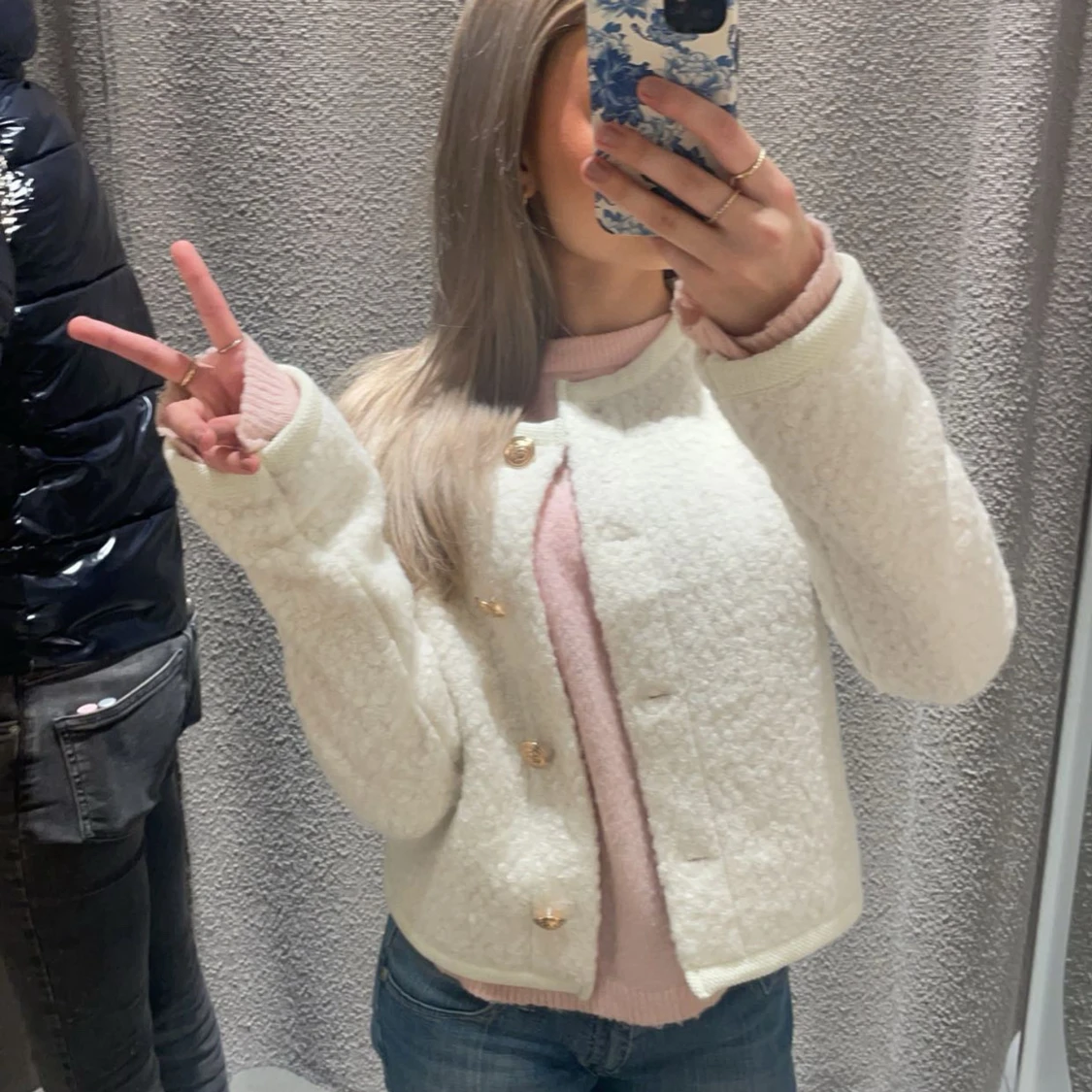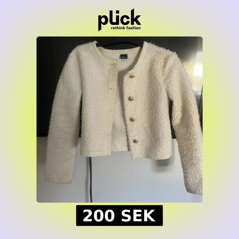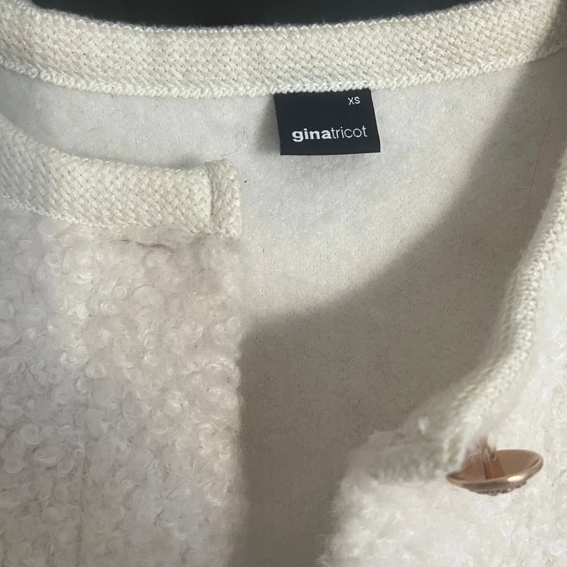 Säljer en söt vit teddyjacka från Gina Tricot i storlek XS. Jackan har rund halsringning, guldiga knappar framtill och är croppad i modellen. Perfekt för att ge en mysig och trendig look.