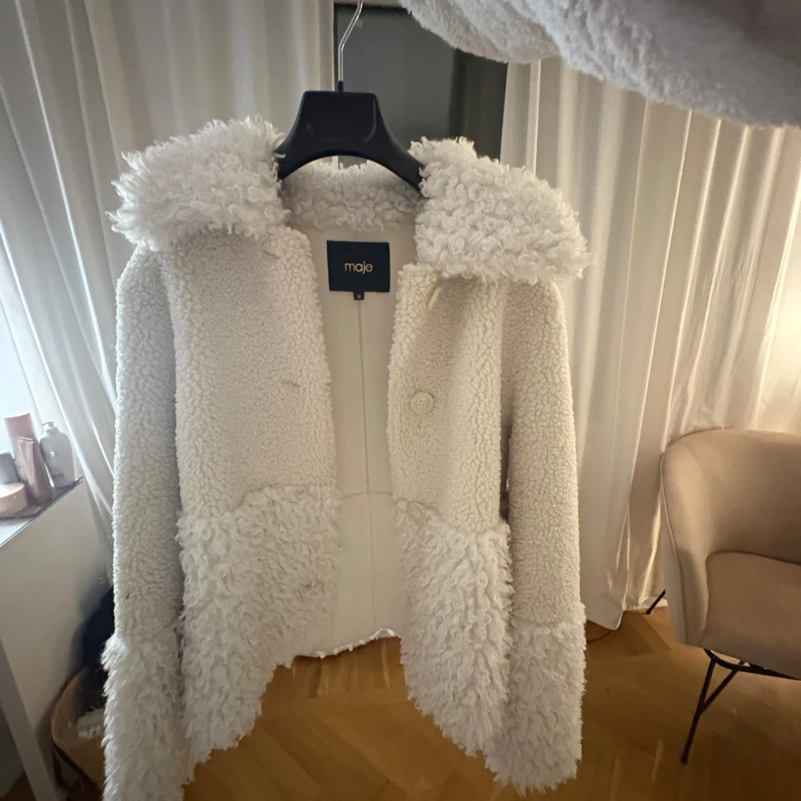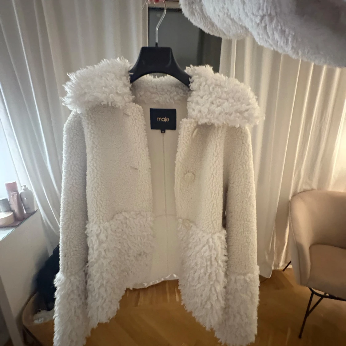 Säljer en superfin vit teddyjacka från Maje i storlek 36. Jackan har fluffig krage och detaljer vid ärmslut och nederkant, samt knappar framtill. Perfekt för dig som vill ha en mysig och trendig look under kyliga dagar.