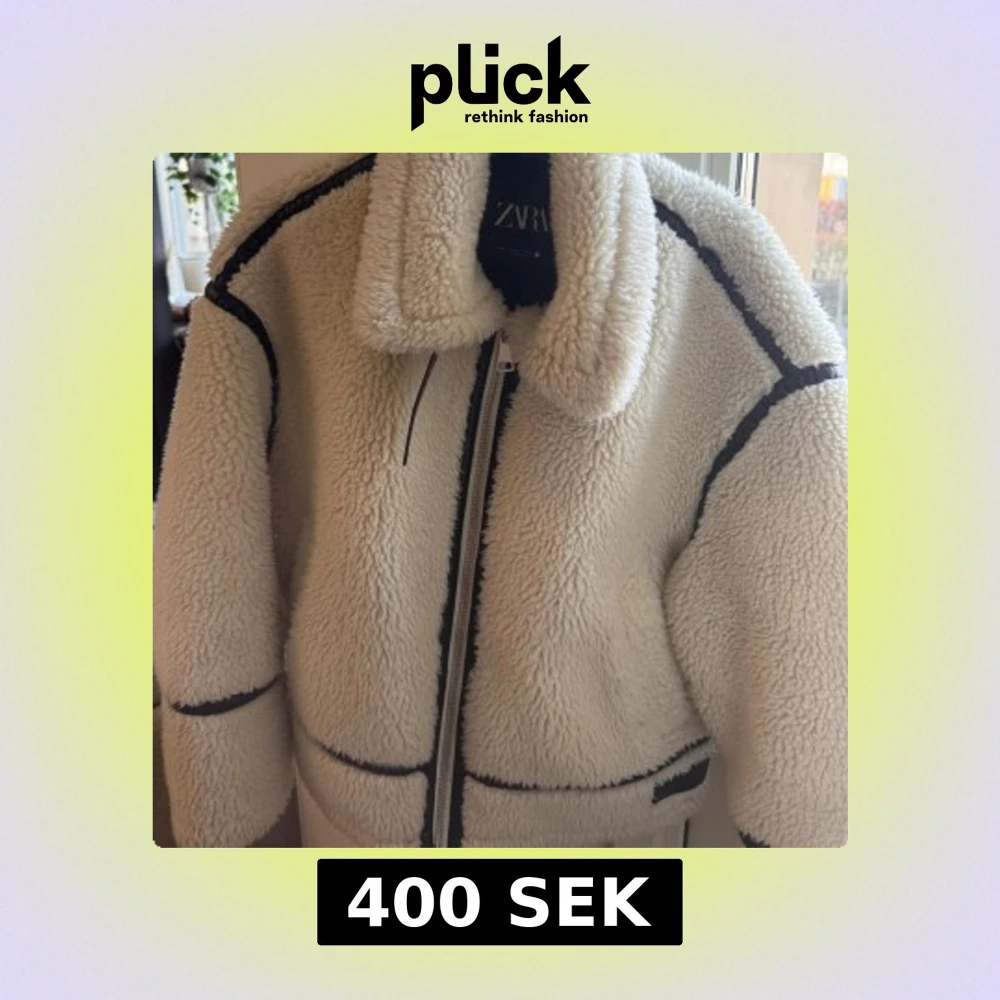 Säljer en mysig vit teddyjacka från ZARA med svarta detaljer och dragkedja. Jackan har en hög krage och långa ärmar. Säljer då den inte kommer till användning, använd enstaka gånger, som ny. Storlek S!🤍